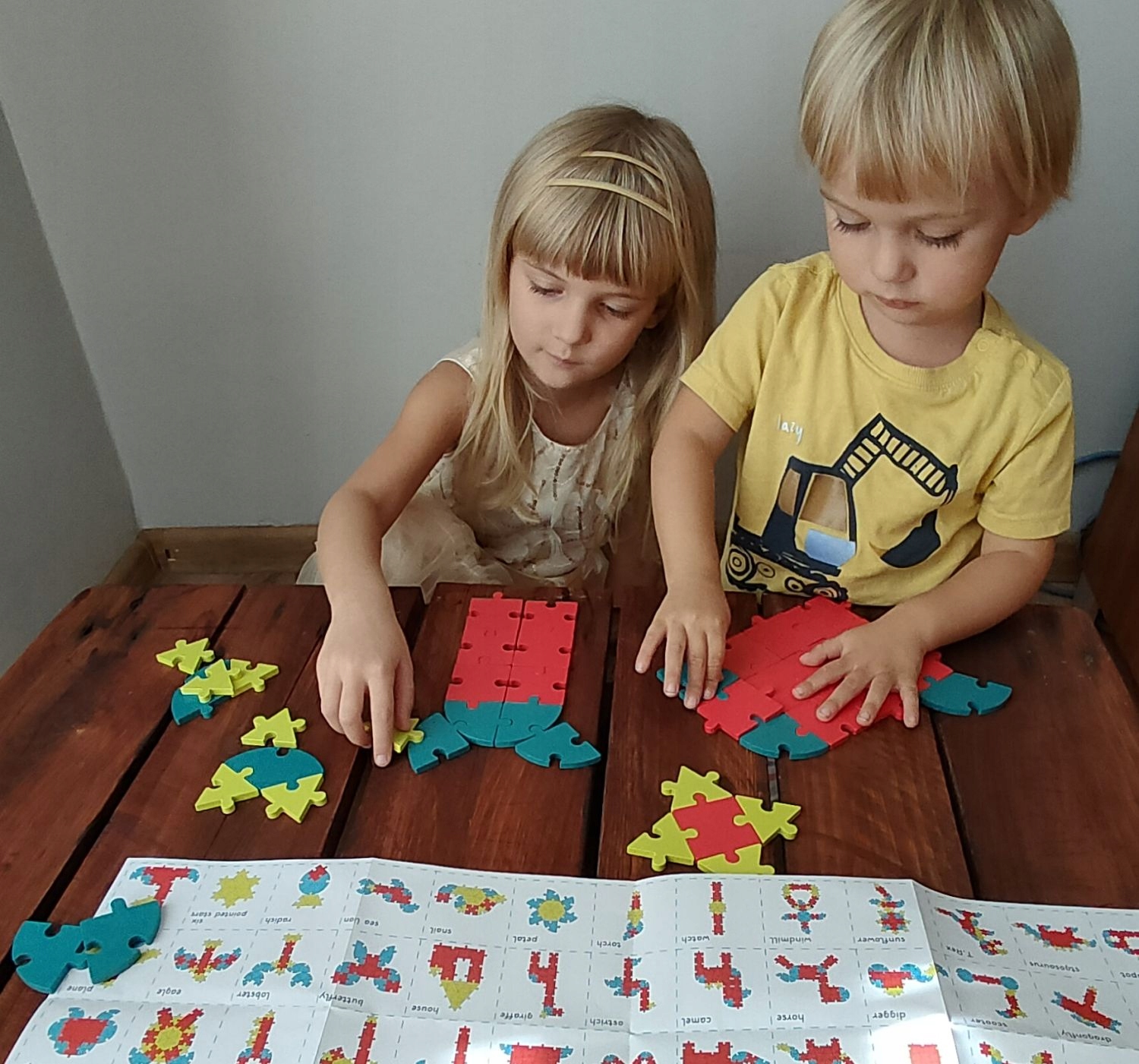 W zestawie jest instrukcja z dziesiątkami wzorów jakie można ułożyć z klocuszków. Poszczególne figury występują w różnych kolorach.