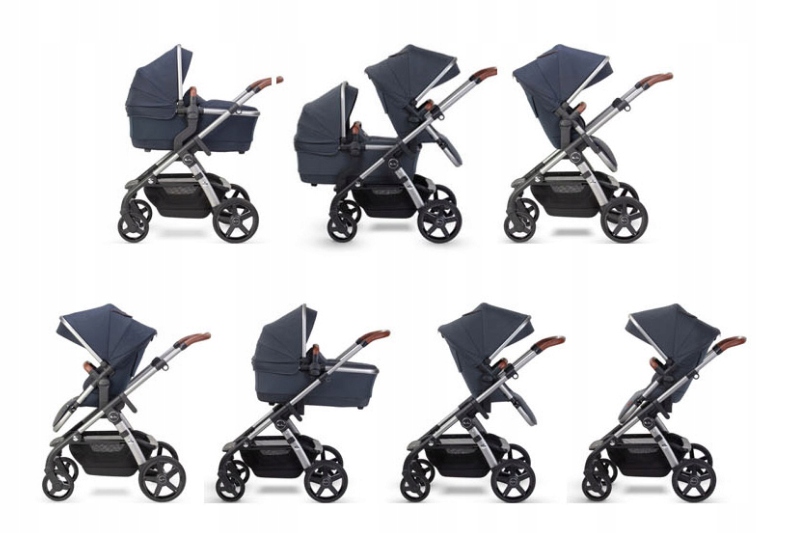 Zestaw zawiera stelaż, 2x gondolę i 2x siedzisko spacerowe, które można ustawić w siedmiu konfiguracjach – z gondolą ustawioną standardowo lub w pozycji podwyższonej, z siedziskiem spacerowym przodem lub tyłem do kierunku jazdy, a także z siedziskiem spacerowym ustawionym przodem lub tyłem do kierunku jazdy, ale w pozycji podwyższonej.