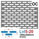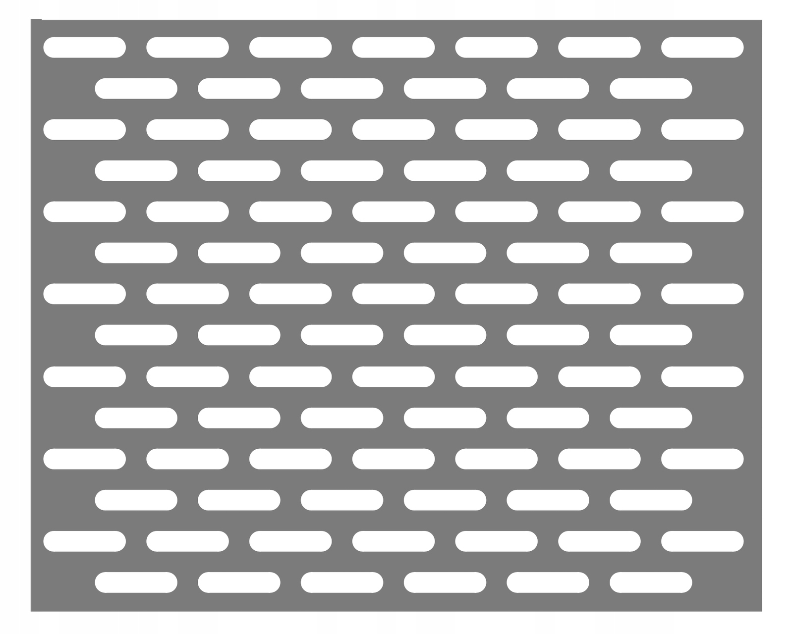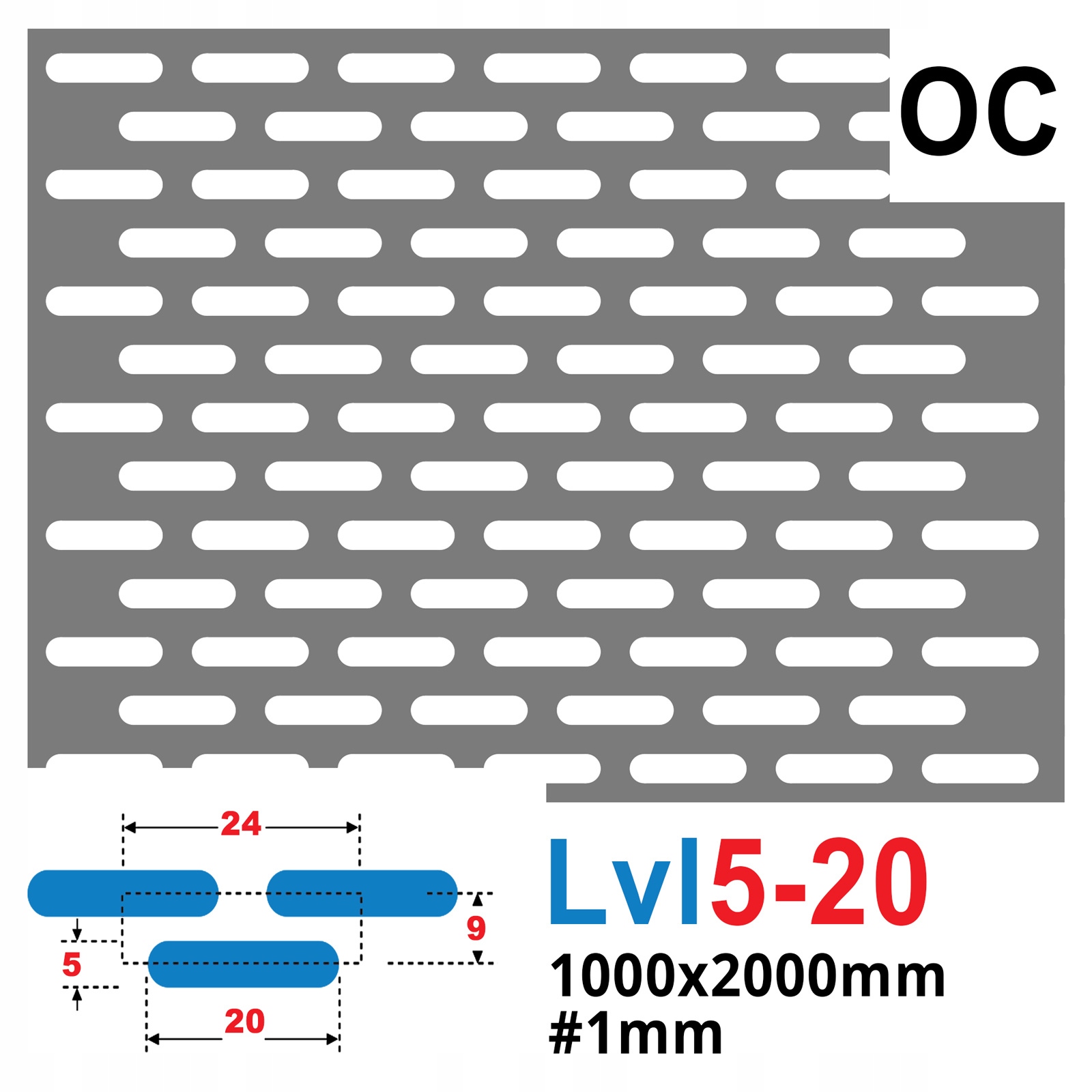 Blacha perforowana ocynkowana (ocynk ogniowy srebrny) z oczkami podłużnymi w układzie mijanym. Kierunek perforacji równoległy do dłuższego boku.
