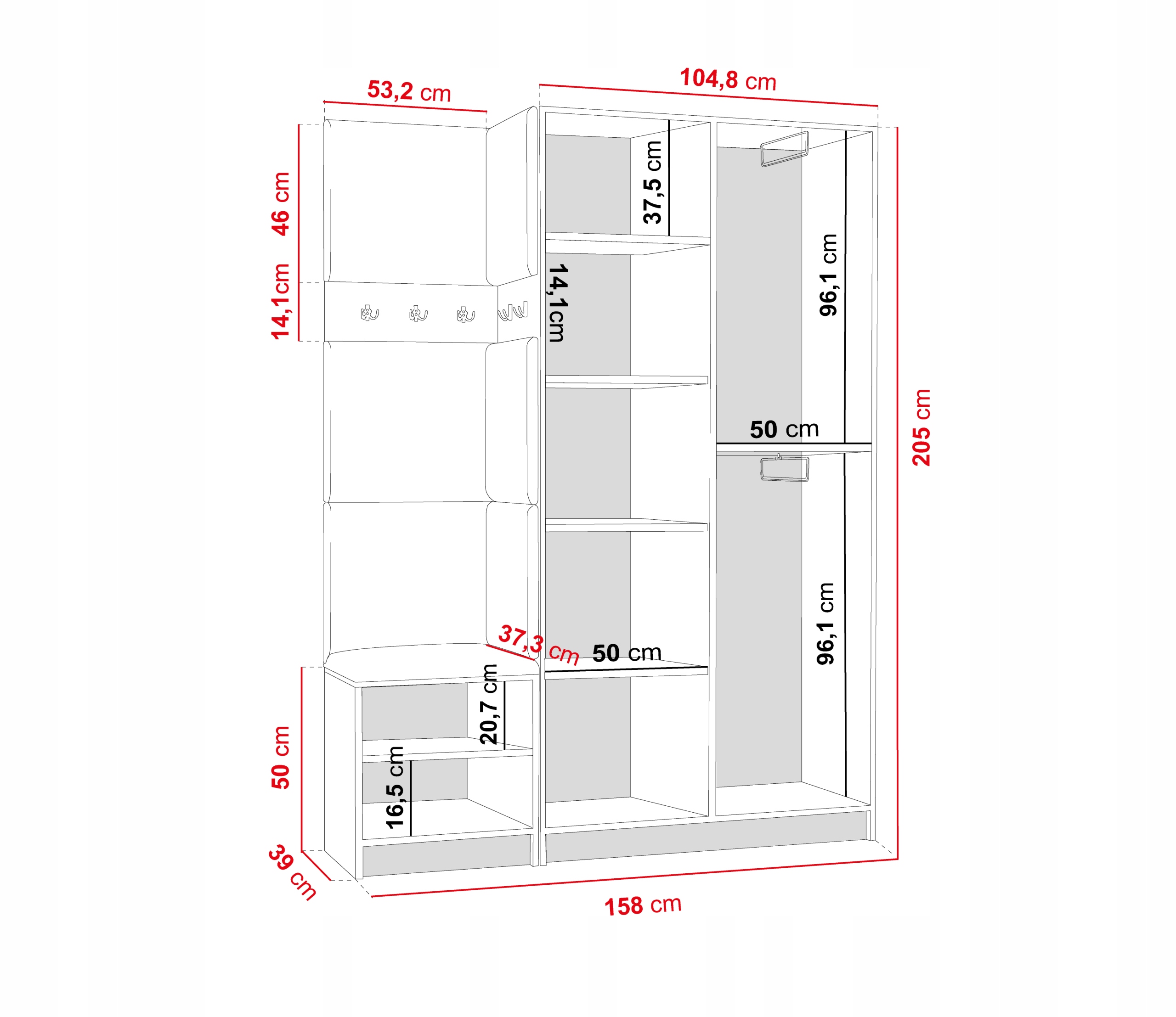 Ergonomiczne wymiary garderoby DIOR 13 zapewniają swobodne umeblowanie każdego przedpokoju.