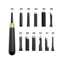 Dwanaście modeli z utwardzanej stali cechuje odporna na wstrząsy z włókna szklanego rączka termicznie łączona i wzmocniona ograniczającą mosiążną tulejką. Prestiżowo naostrzone ostrze wyjątkowo przydatne w szkołach sztuki pięknej.