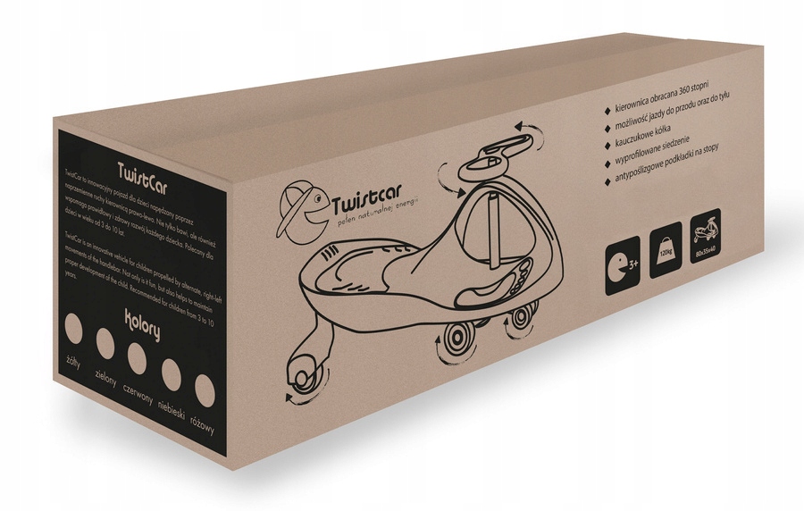 Wspiera prawidłowy rozwój dziecka, wykorzystując dziecięcą energię i przekształcając ja w ruch .TwistCar nie jest wyposażony w pedały, łańcuchy, baterie czy zasilacze. Jak więc przemieszcza się? Wystarczy lekko skręcić kierownicą w prawo, następnie w lewo i znowu w prawo. Dzięki naprzemiennym ruchom kierownicą prawo-lewo, TwistCar jest napędzany siłą dziecięcej energii!TwistCar jest bezpieczny i cichy.Ta oryginalna, ekologiczna zabawka jest świetną alternatywą dla telewizji czy gier komputerowych. I najważniejsze - zapewnia dzieciom fantastyczną zabawę! I możesz jeździć razem dzieckiem.