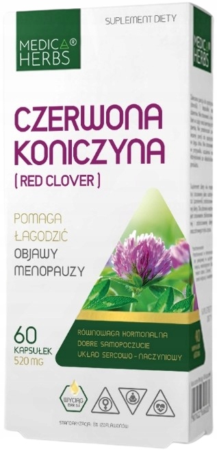 Składniki: wyciąg z części naziemnych Trifolium pratense 520 mg (41,6 mg izoflawonów); żelatyna (kapsułka).