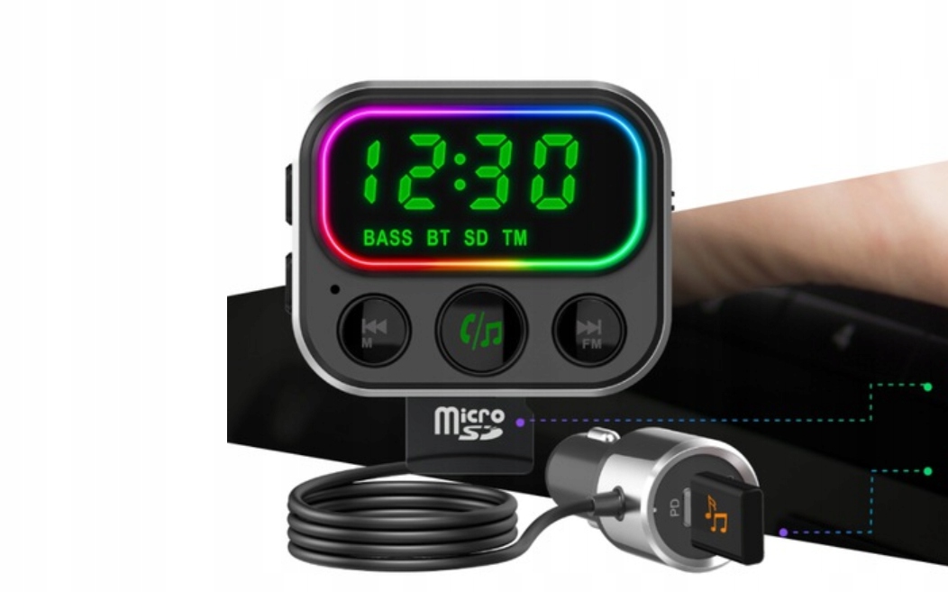 Transmiter FM z funkcja głośnomówiącą, umożliwiający odtwarzanie plików audio z nośników zewnętrznych za pośrednictwem wyjścia AUX, Bluetooth lub kart pamięci micro SD.