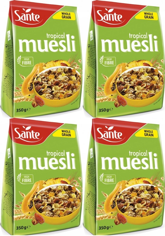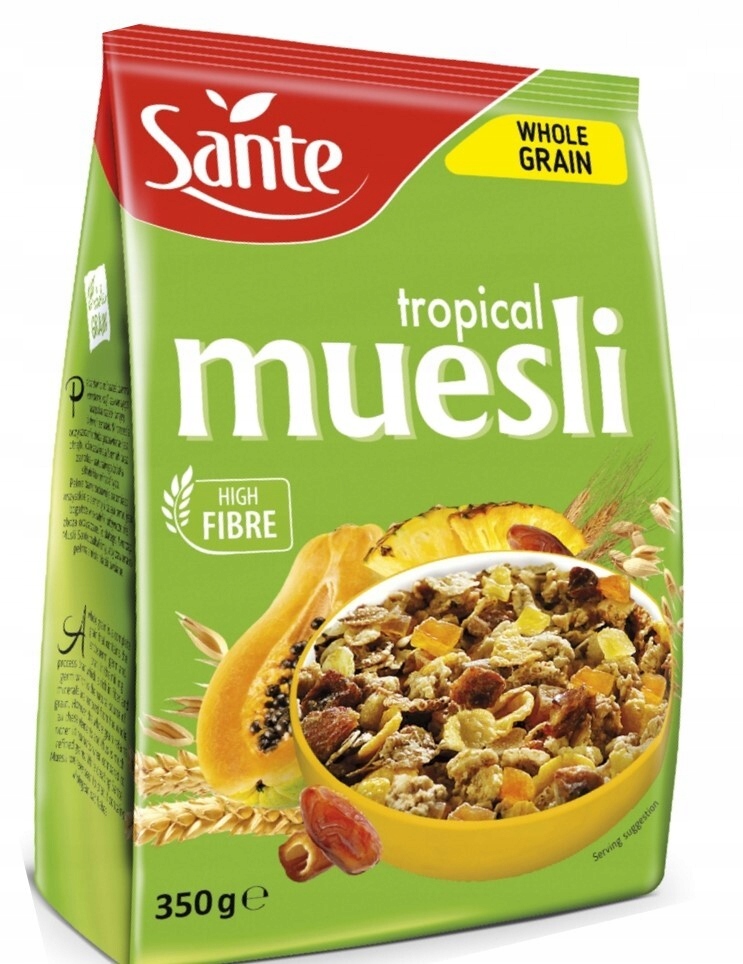 Płatki zbożowe 75% [pełnoziarniste płatki owsiane 34%, płatki jęczmienne, płatki pszenne (pszenica, nierafinowany cukier trzcinowy, sól morska, ekstrakt słodu jęczmiennego), płatki kukurydziane (grys kukurydziany, nierafinowany cukier trzcinowy, sól morska, ekstrakt słodu jęczmiennego)], mieszanka owoców 16% w zmiennych proporcjach [suszone daktyle (daktyle, mąka ryżowa), kandyzowany ananas (cukier trzcinowy, ananas, regulator kwasowości: kwas cytrynowy), kandyzowana papaja (cukier trzcinowy, papaja, regulator kwasowości: kwas cytrynowy)], nierafinowany cukier trzcinowy, mąka: jęczmienna, kukurydziana; nieutwardzony tłuszcz palmowy, syrop glukozowy, melasa trzcinowa, płatki kokosowe, sól morska, aromat, emulgator: lecytyny z (soi); cynamon.