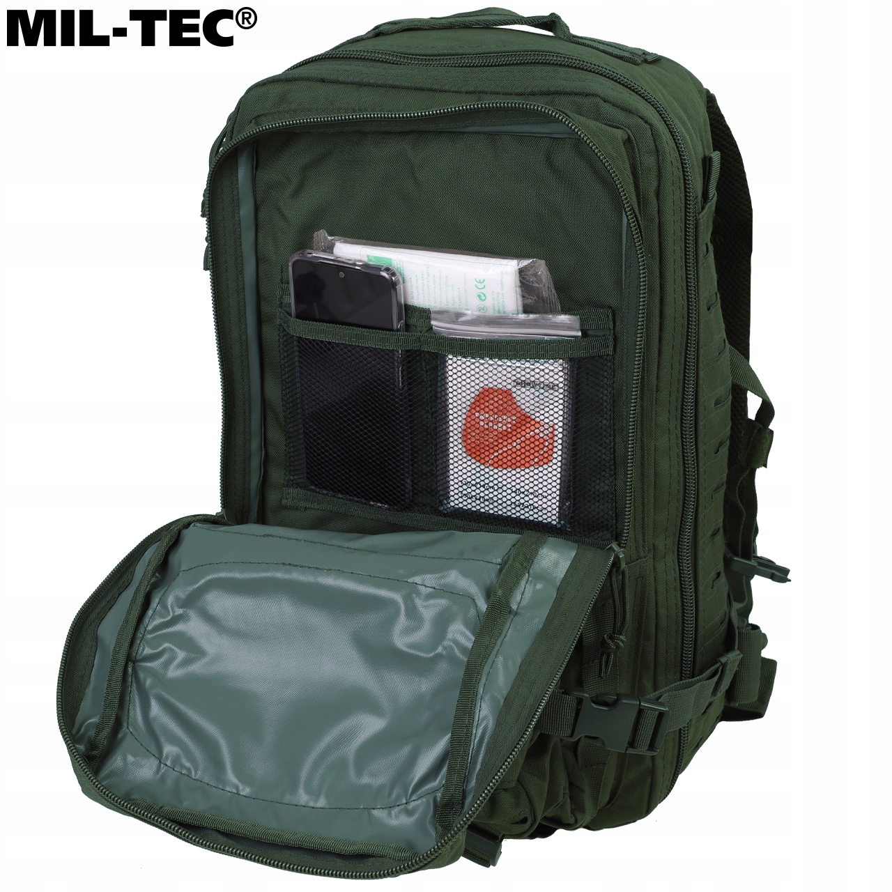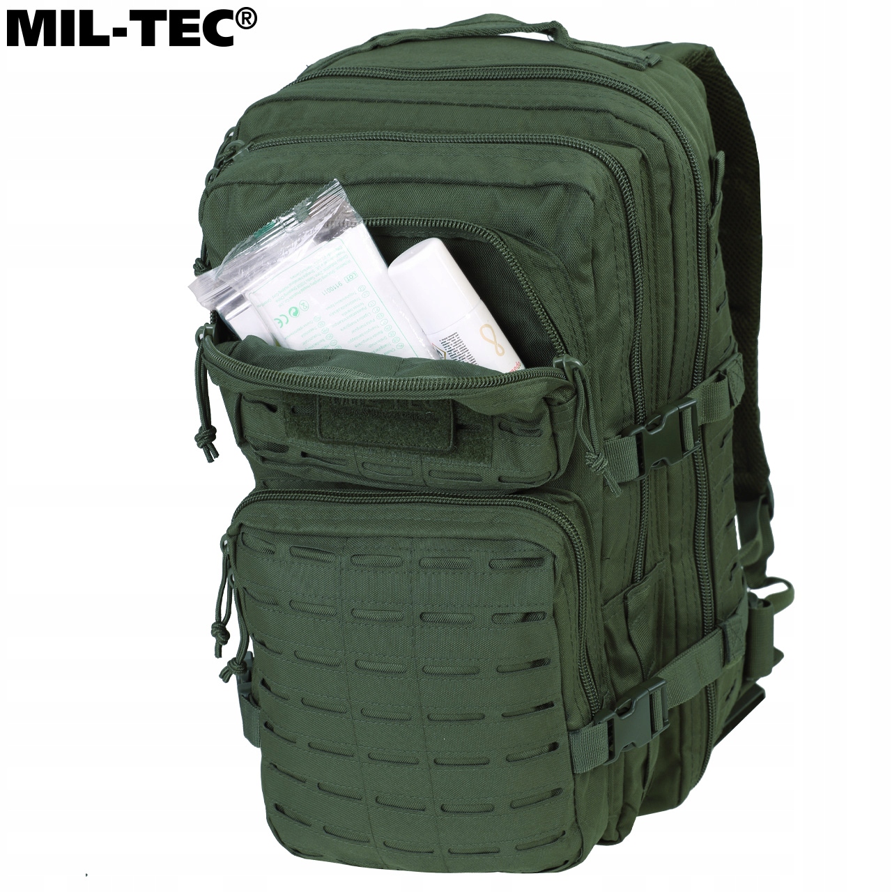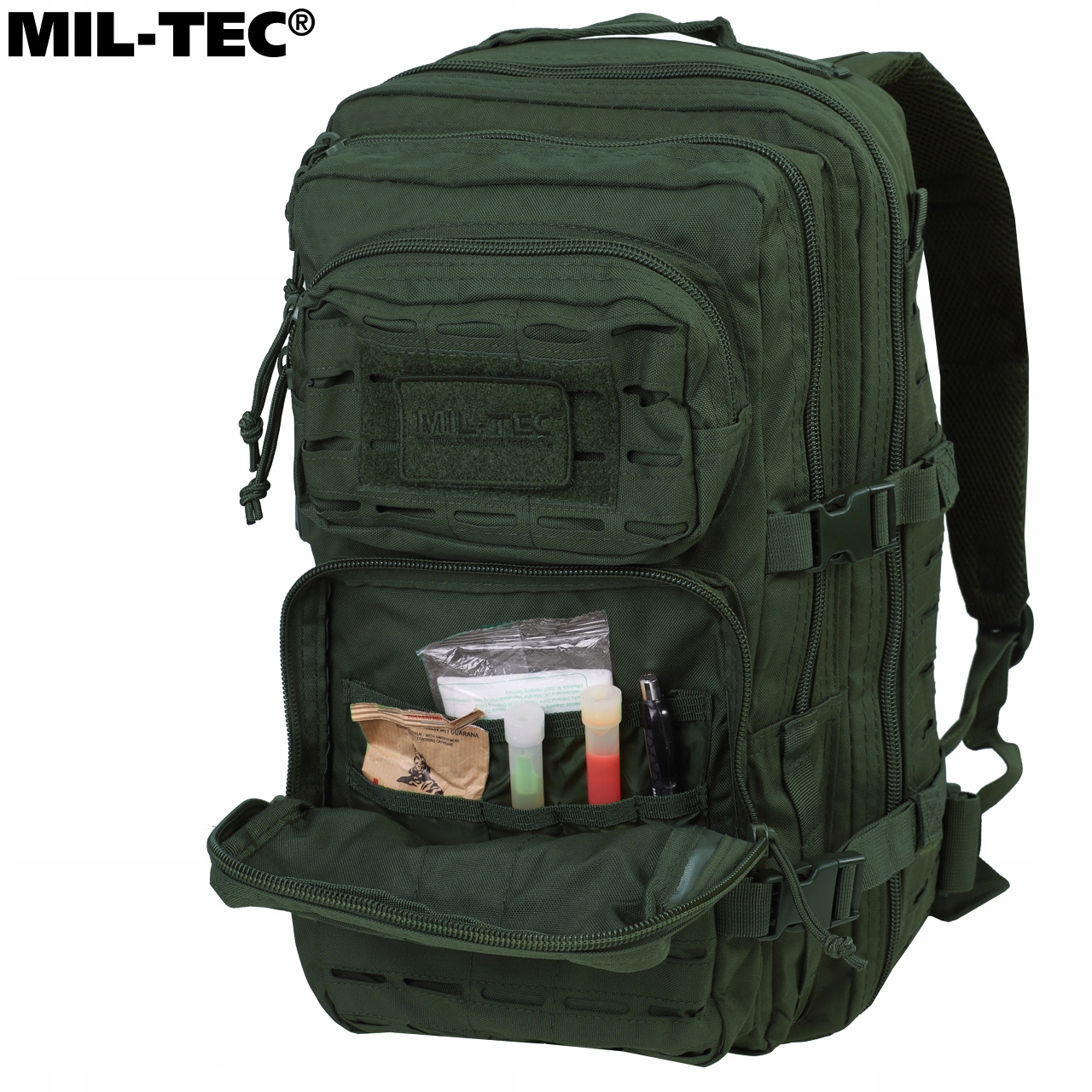 UWAGA! Przedmiotem oferty jest plecak Mil-Tec Assault Laser Cut w kolorze Olive. Pozostałe elementy służą przedstawieniu funkcjonalności.