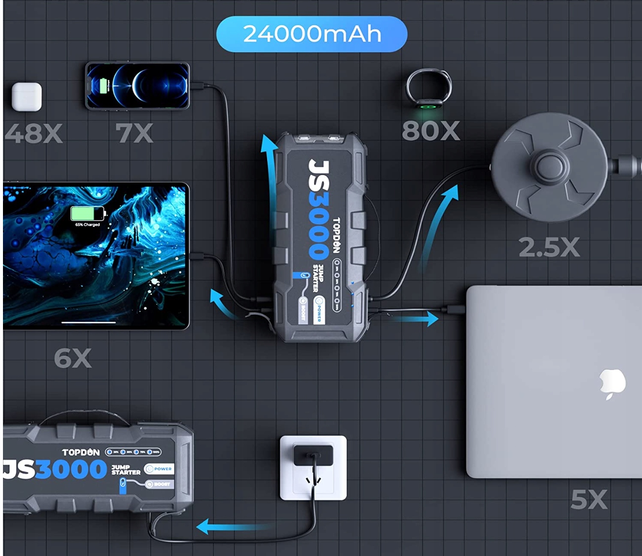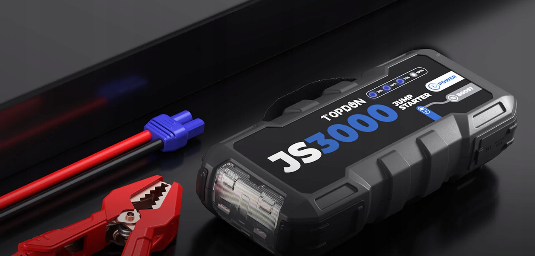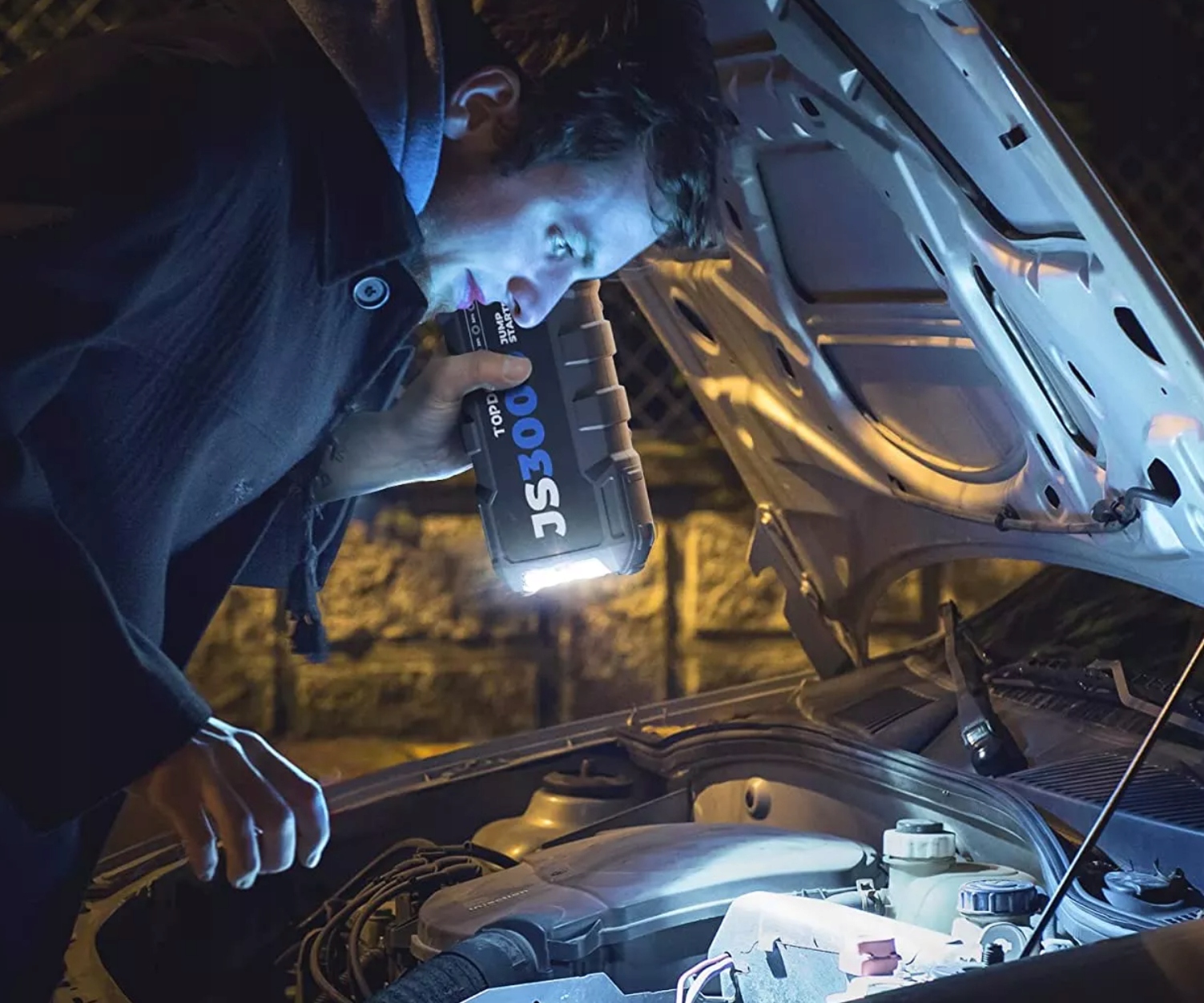 Starter JS3000 to narzędzie do szybkiego uruchamiania aż do 3000 A, power bank z wbudowaną latarka LED. TOPDON JS300 posiada wbudowany hak i Stopka