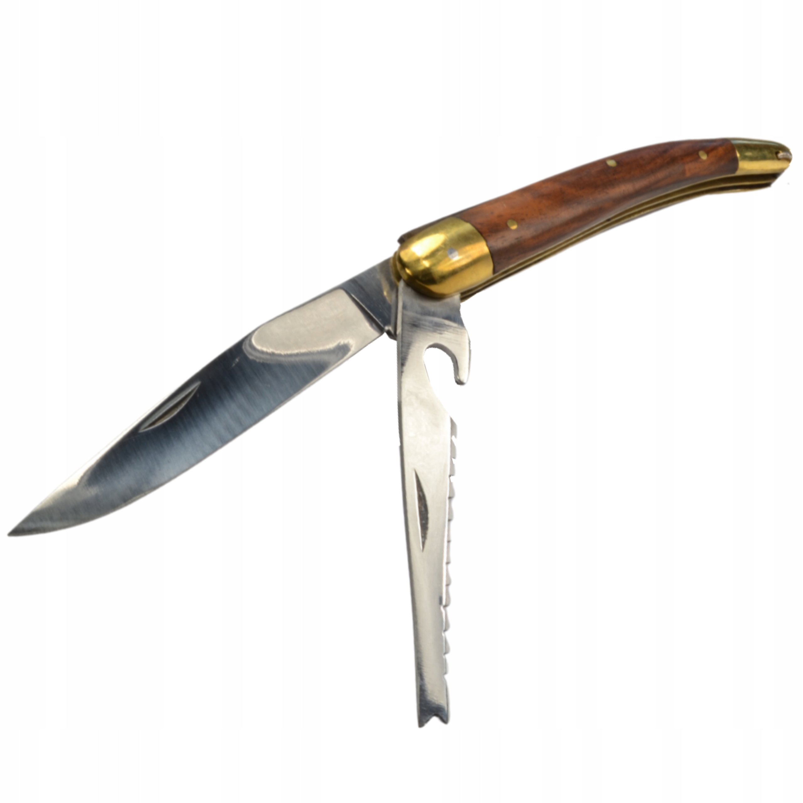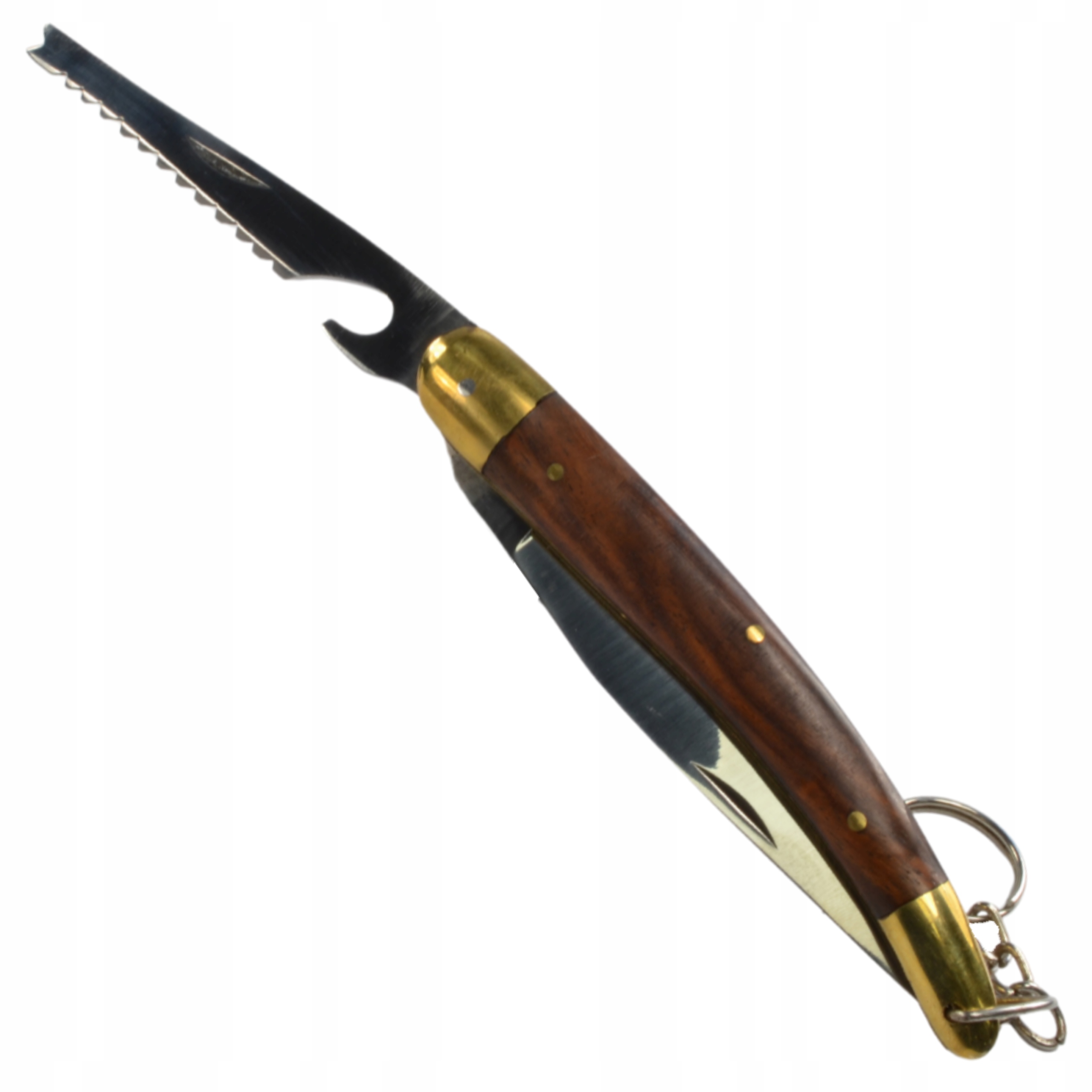 Praktyczny nóż wędkarski. Posiada dwa ostrza. Pierwsze służy do krojenia i filetowania, drugie do skrobania ryb. Jest jeszcze otwieracz do butelek i wypychacz haczyków. Rękojeść noża wykonana z drewna, zdobiona mosiężnymi elementami. Ostrze wykonane z dobrej stali 440.