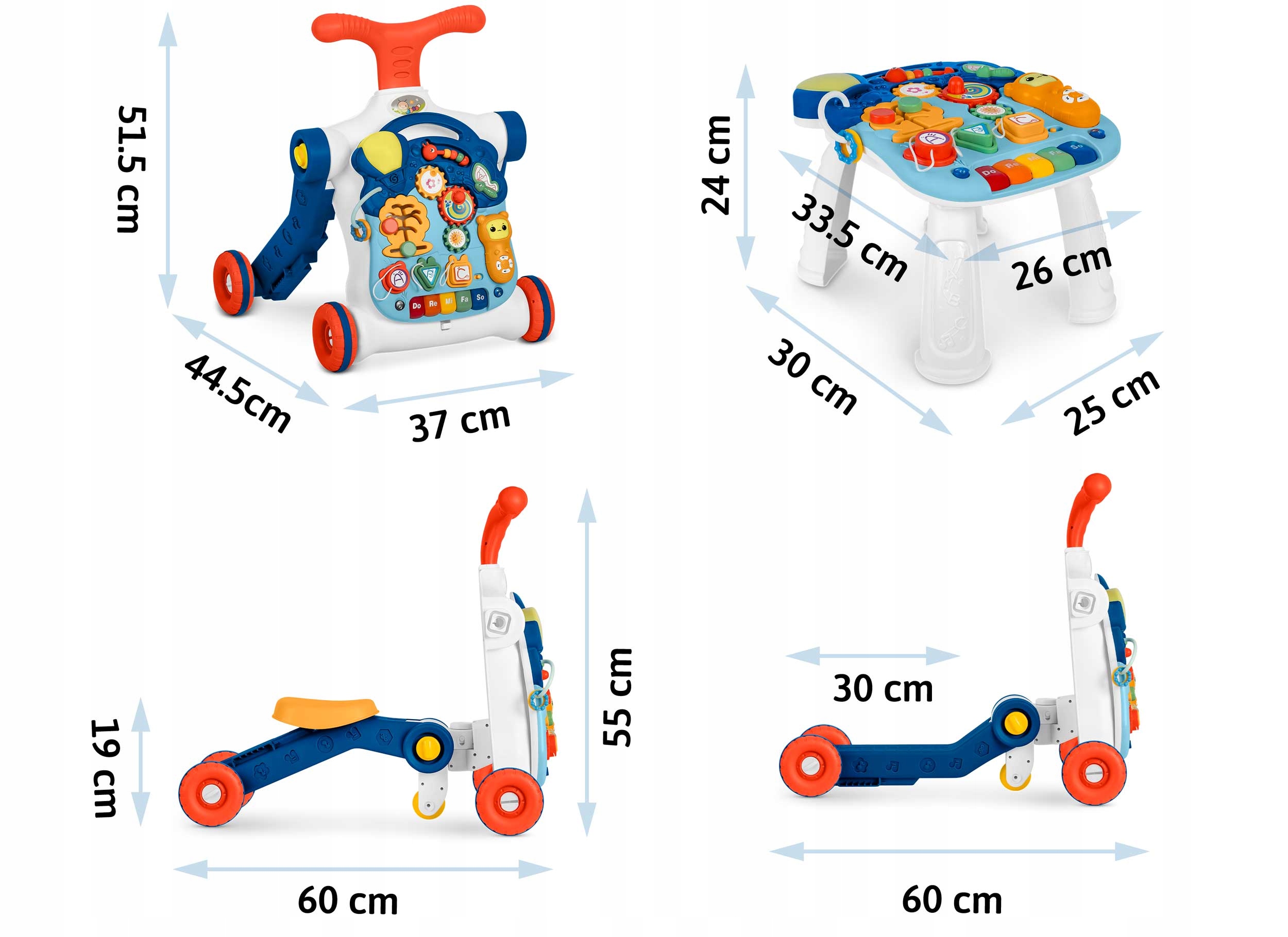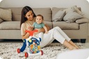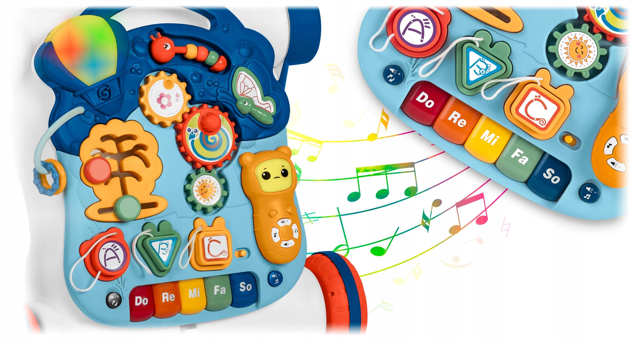 Oprócz nauki chodzenia, produkt idealnie nadaje się do nauki liczb, kolorów i kształtów. Wyjmowany panel (aby wyjąć panel, należy nacisnąć przycisk znajdujący się z dołu konstrukcji, aby zwolnić zaczep) może być używany jako tablica edukacyjna, a po dodaniu do niego nóżek w szybki sposób zmienia się w stolik edukacyjny.