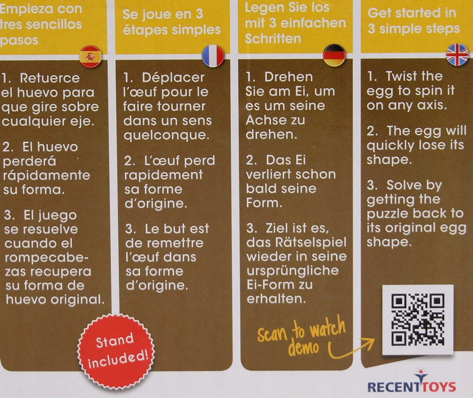 Recent Toys to producent łamigłówek z Holandii. Jak sami o sobie mówią: „Tworzą zagadki dla wszystkich.” Jeżeli lubisz matematykę, logikę, układanie wzorów lub po prostu jesteś cierpliwy i wytrwały, to na pewno znajdziesz coś dla siebie! Choć wszystkie łamigłówki są unikatowe to mają one następujące cechy wspólne:
