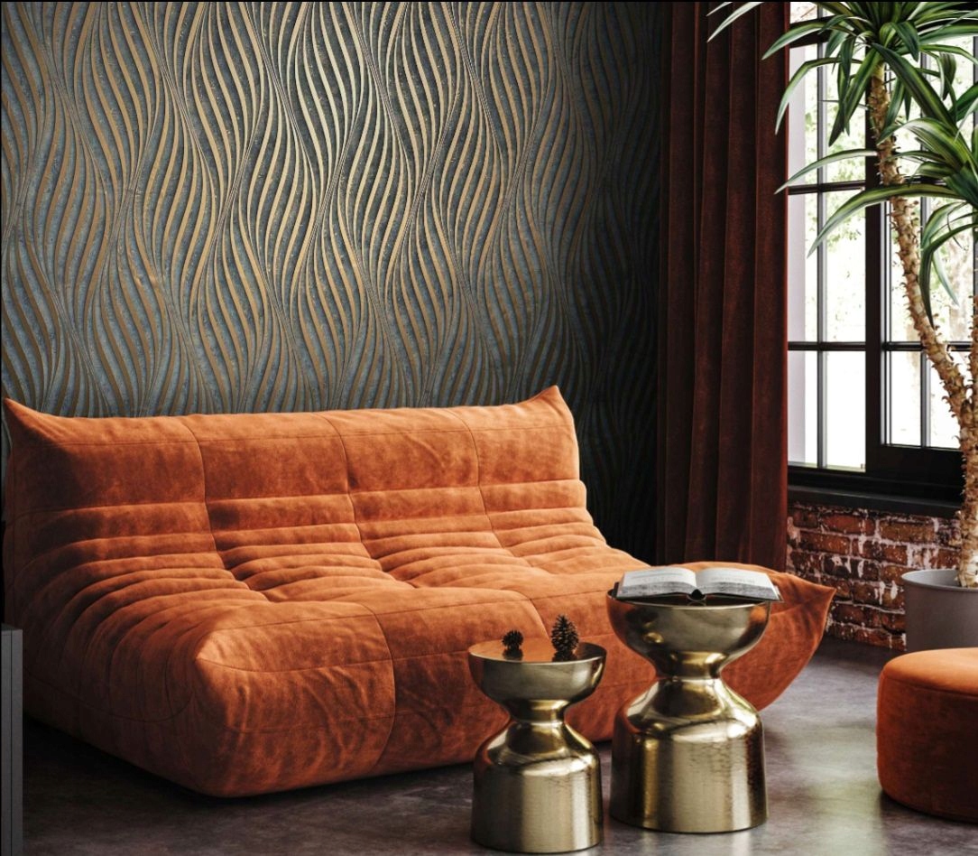 tło tapety ma fakturą betonu z miedzianymi "przetarciami",