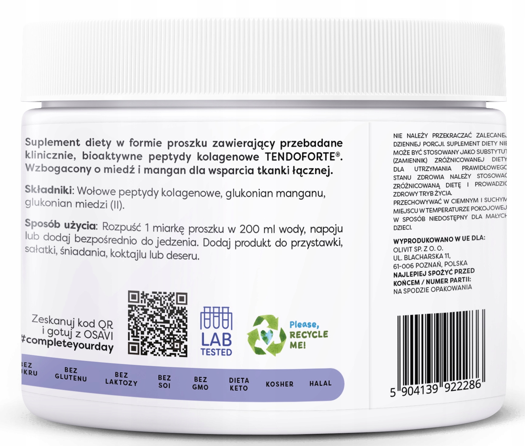 Suplement diety w formie proszku zawierający przebadane klinicznie, bioaktywne peptydy kolagenowe TENDOFORTE®. Wzbogacony o miedź i mangan dla wsparcia tkanki łącznej.