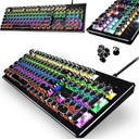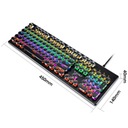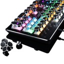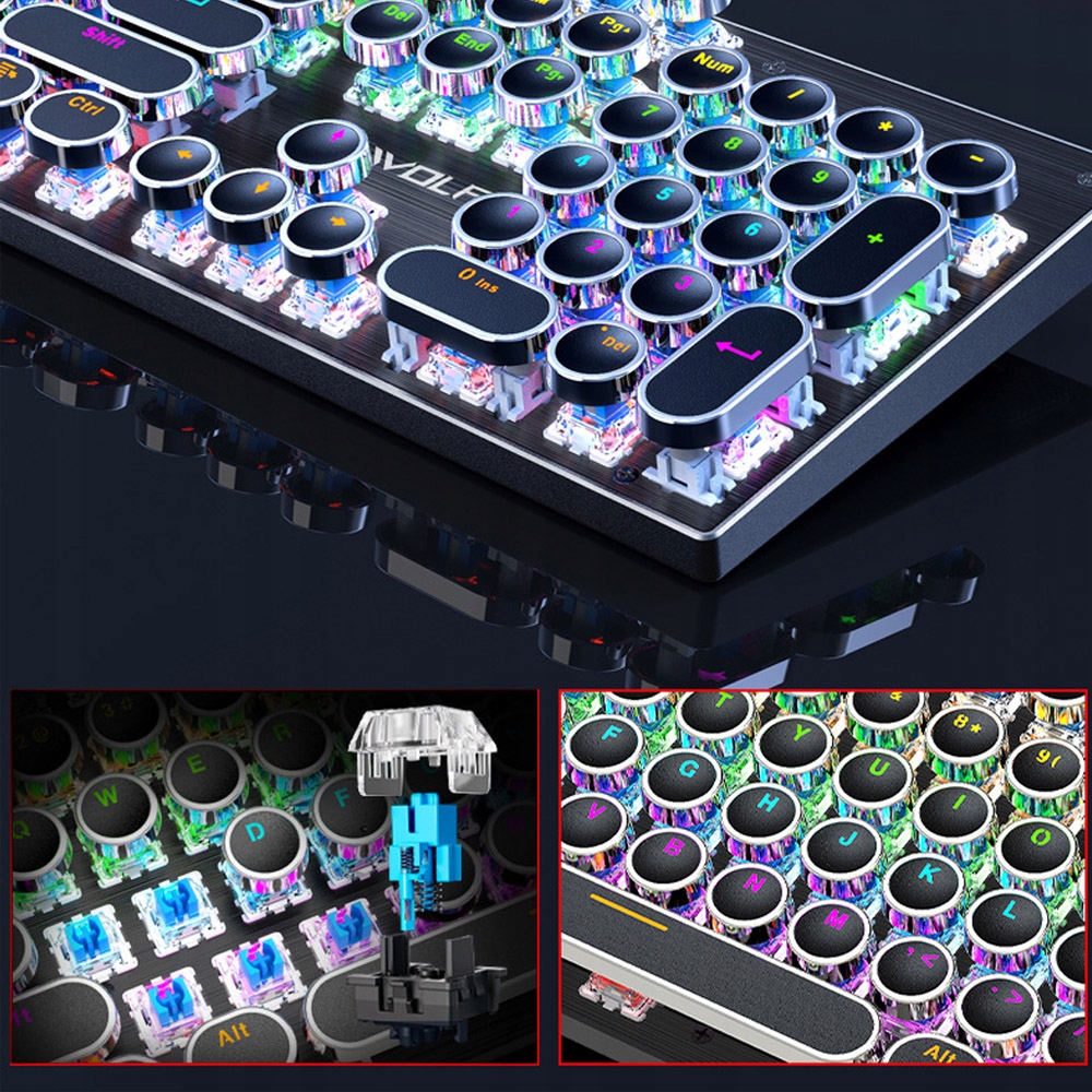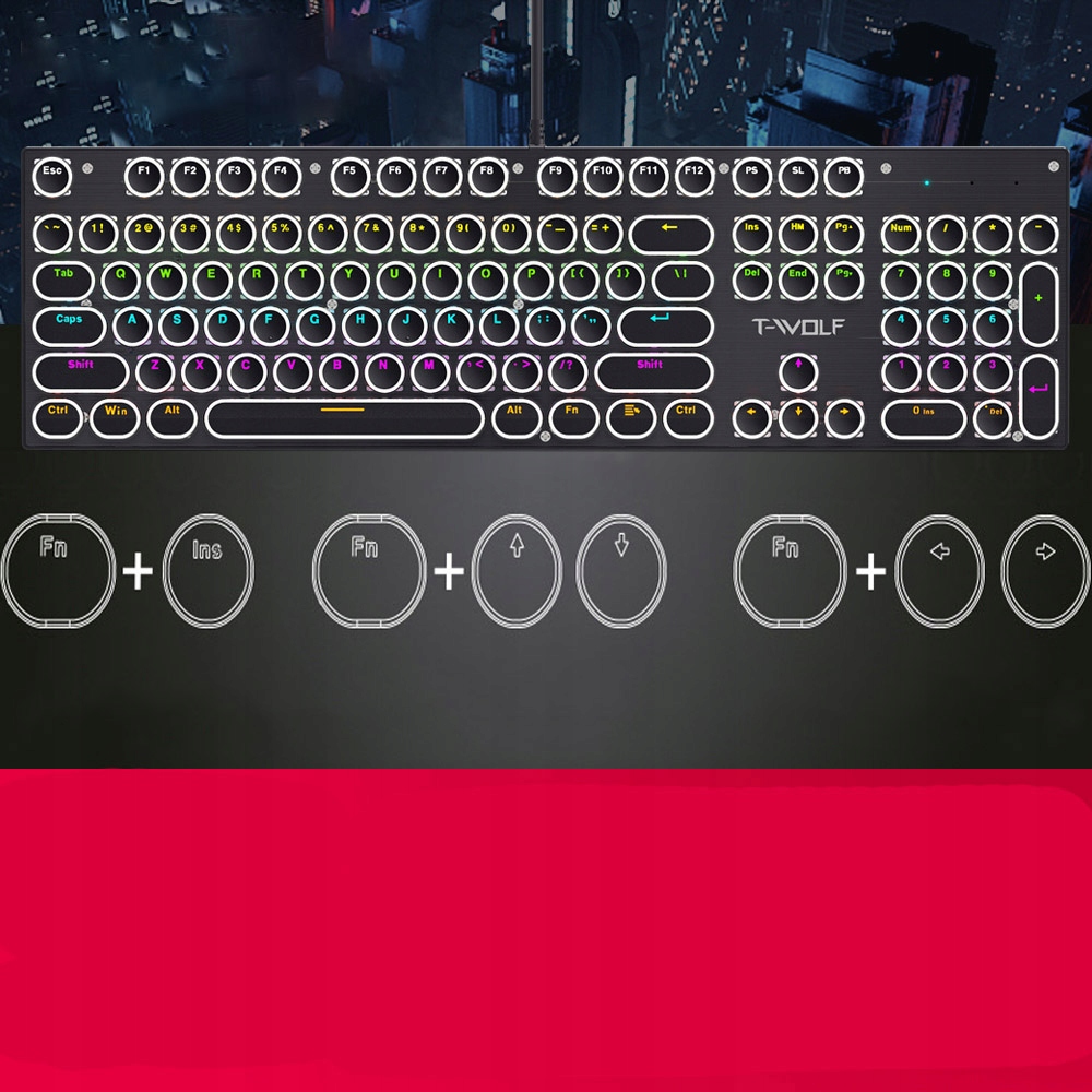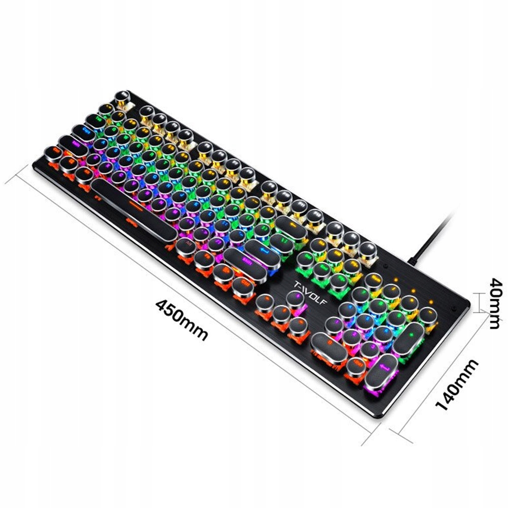 Игровая клавиатура T-Wolf T75 предназначена для геймеров. Продукт он оснащен круглыми механическими клавишами с подсветкой в стиле ретро, что значительно улучшает комфорт и игровой опыт, а также высокая отзывчивость. Маркировка кнопок они выполнены в лазерной технике, что позволяет сохранить читаемость клавиатуры Даже при долгосрочное использование. Современный и уникальный дизайн сделает устройство отличное дополнение к игровой позиции, он также будет работать в сочетании с компьютерами в офис или дома. Клавиатура имеет девять режимов подсветки, изменяемых с помощью комбинации клавиш FN INS. Он изготовлен из высококачественных материалов, устойчивых к электричеству и затопление. Он подключается с помощью длинного усиленного USB-кабеля.