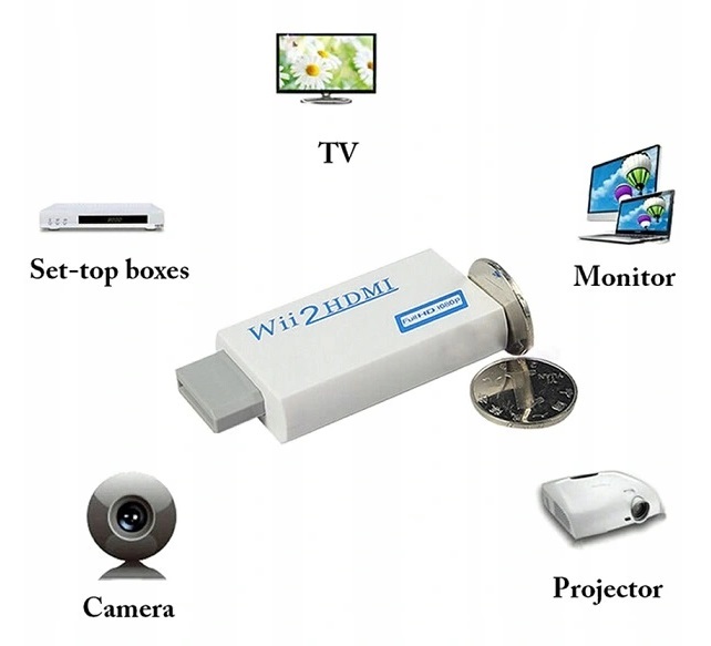 Adapter umożliwia podłączenie konsoli Wii do wejścia HDMI telewizora wysokiej rozdzielczości. Konsola do gier Nintendo Wii została wprowadzona na rynek tuż przed pojawieniem się pełnego HDMI z obsługą urządzeń. Teraz możesz przynieść swoją ulubioną konsolę do gier z powrotem do 21 wieku do obrazu w jakości HD.