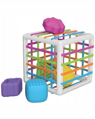 Dotykowa zabawka, przeznaczona dla dzieci od 10. miesiąca życia stymuluje rozwój najmłodszych użytkowników. Oprócz kostki, w zestawie znajduje się sześć klocków o różnych kształtach i rozmiarach. Elastyczna kostka została stworzona z bezpiecznych dla zdrowia dziecka materiałów.