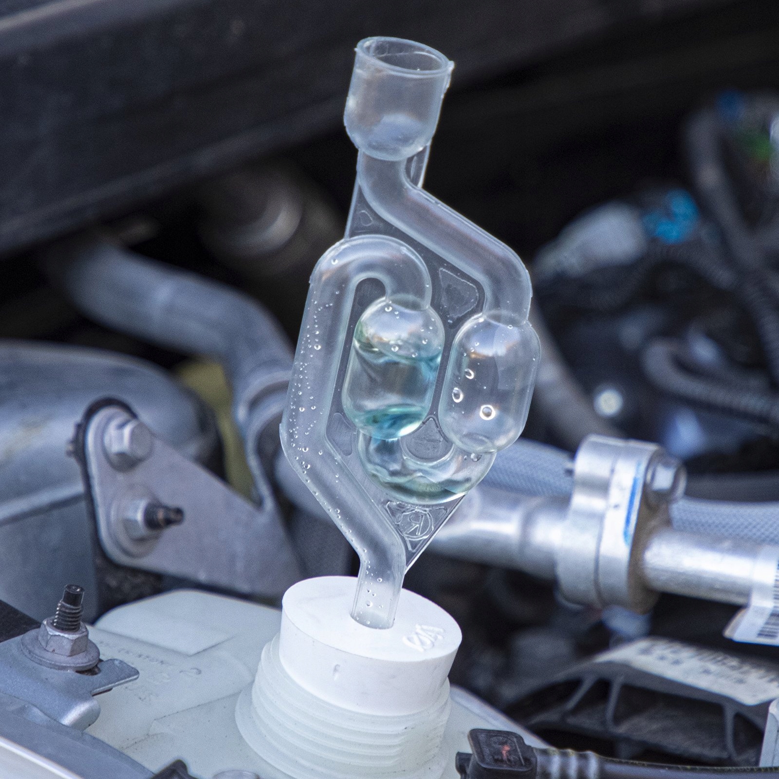 Dostępny w zestawie adapter pasuje do otworu zbiorniczka wyrównawczego lub chłodnicy o fi 41 mm.