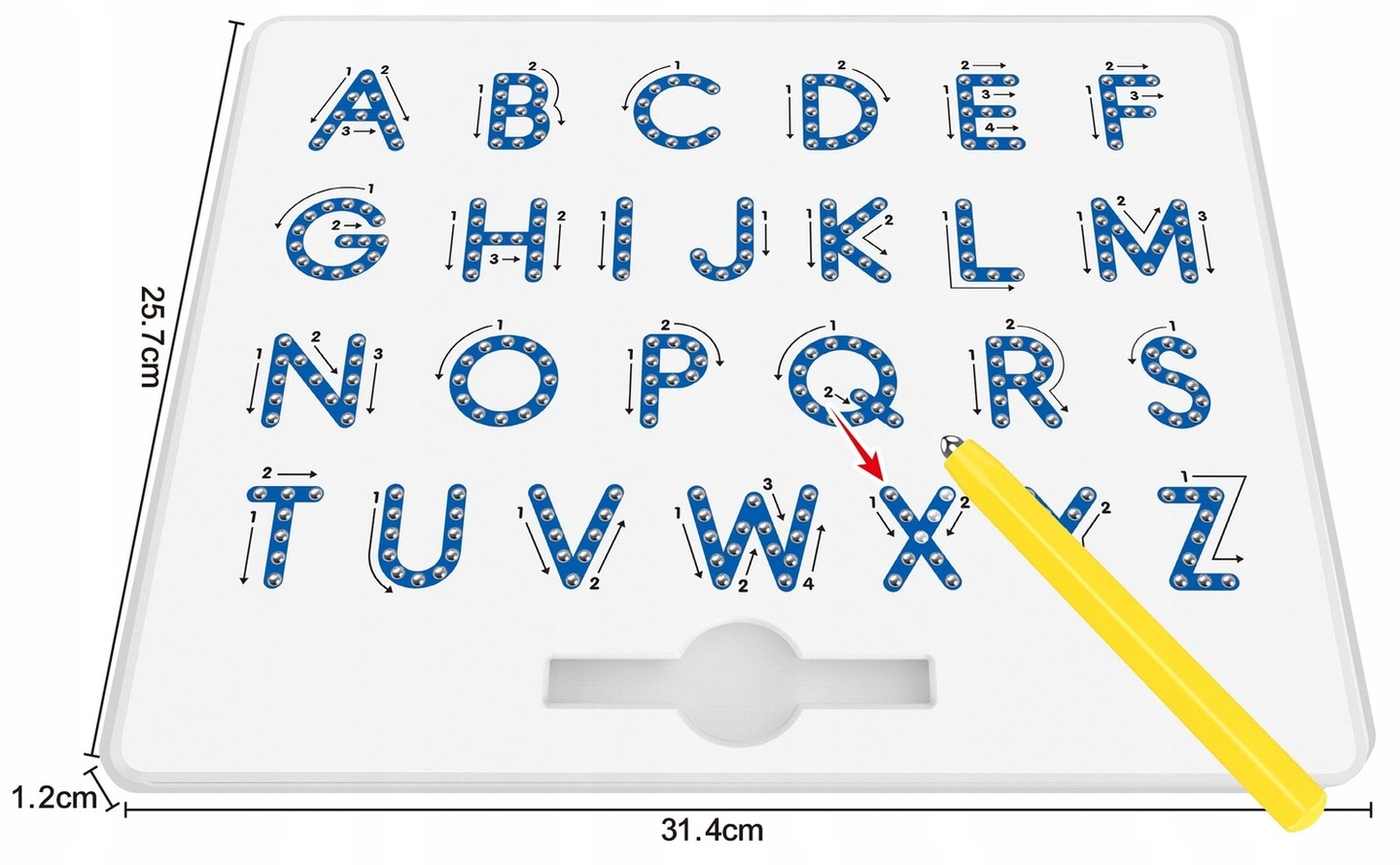 Rewelacyjna zabawka dla dzieci od 3 roku życia. Dzięki tej edukacyjnej tablicy dzieciaki nauczą się liter alfabetu pisząc na specjalnej tablicy przy pomocy metalowych kuleczek. Na tablicy obok literek zaznaczone są ponumerowane strzałeczki, pomogą one wskazując kierunek oraz kolejność zapisu literek.