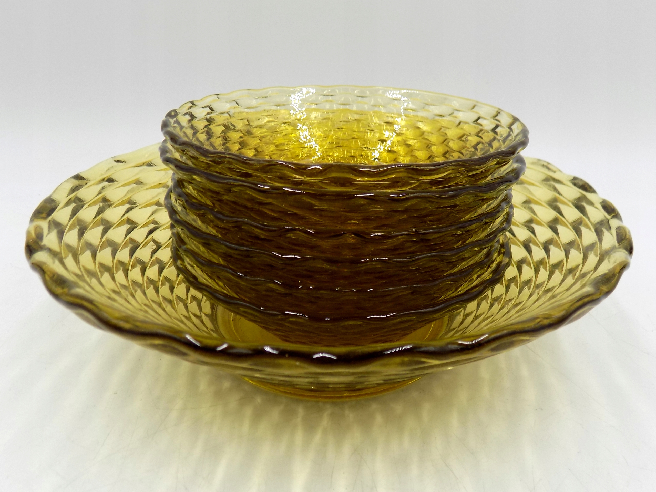 Zestaw salaterek z miseczką z Huty Szkła Prądniczanka z lat 70-tych. Szkło prasowane barwione w masie. Wymiary; miska wys. 5,5 x 19,5 cm; salaterki 3 x 11,5 cm.