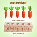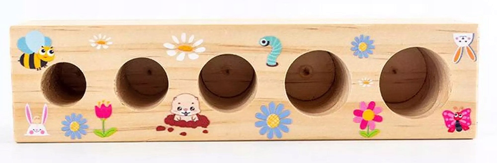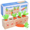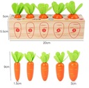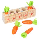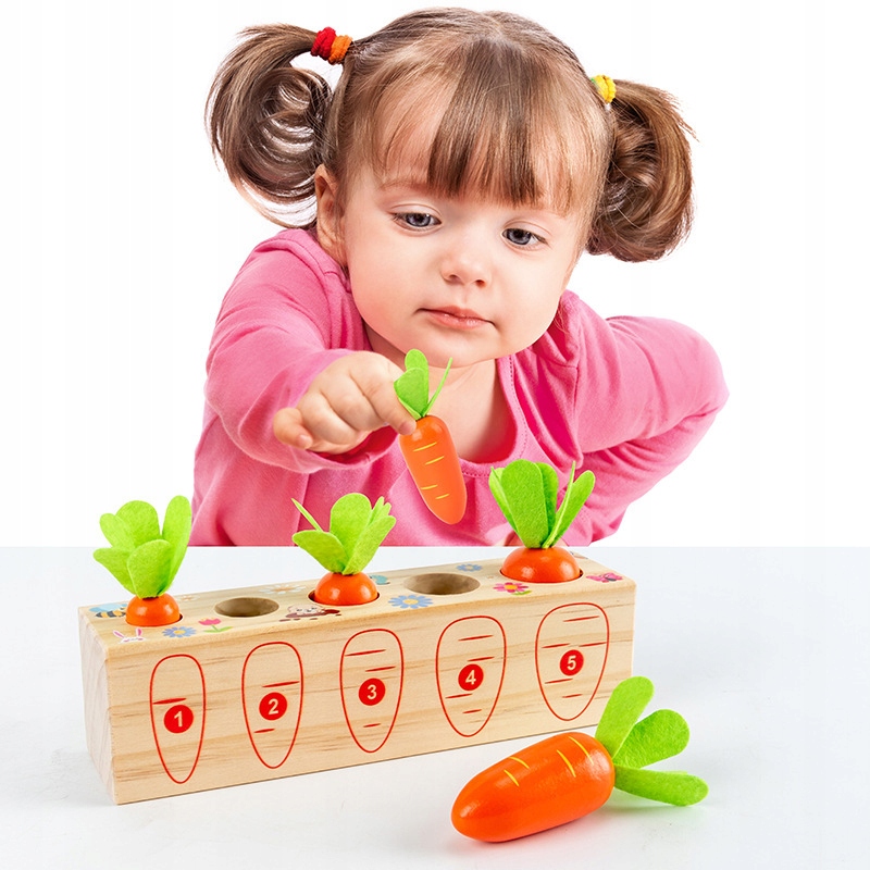 Zabawa polega na wyjmowaniu i wkładaniu drewnianych marchewek do specjalnie przygotowanych do tego otworów.
