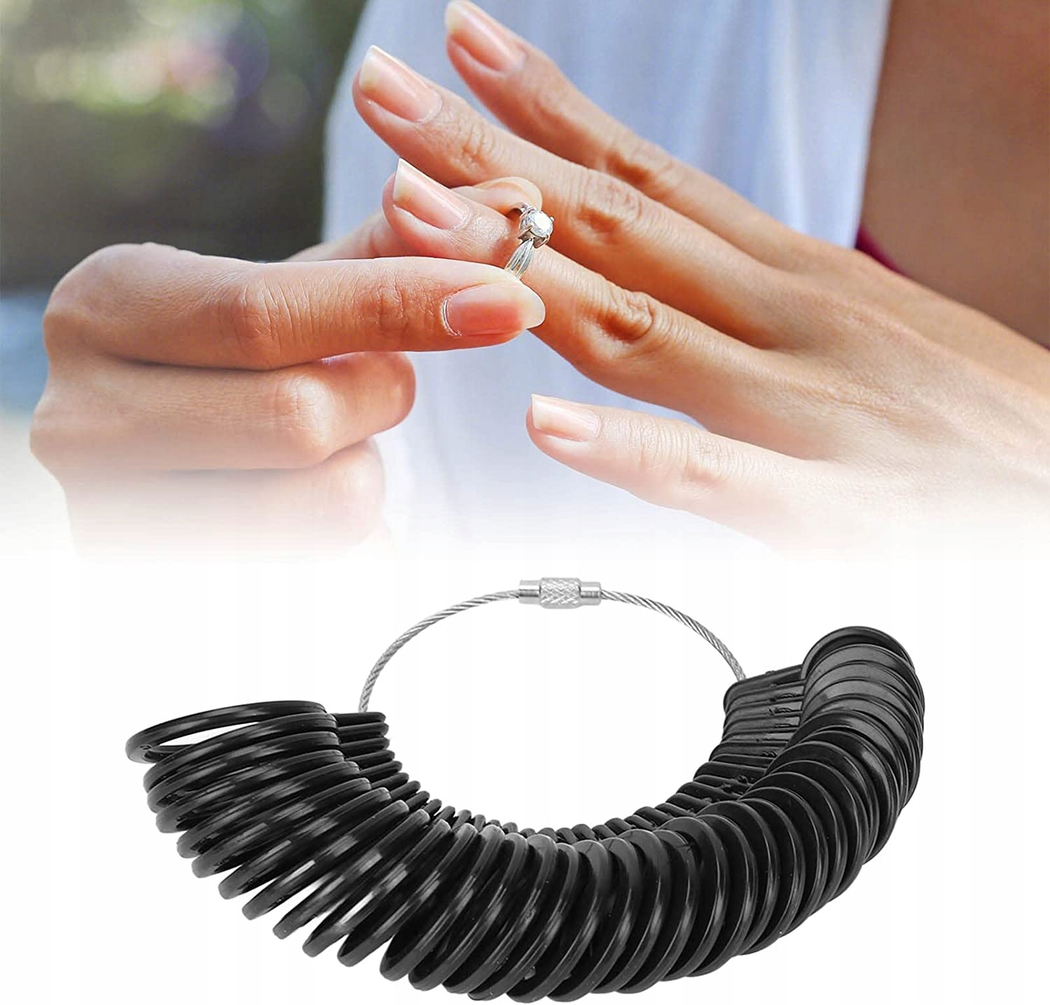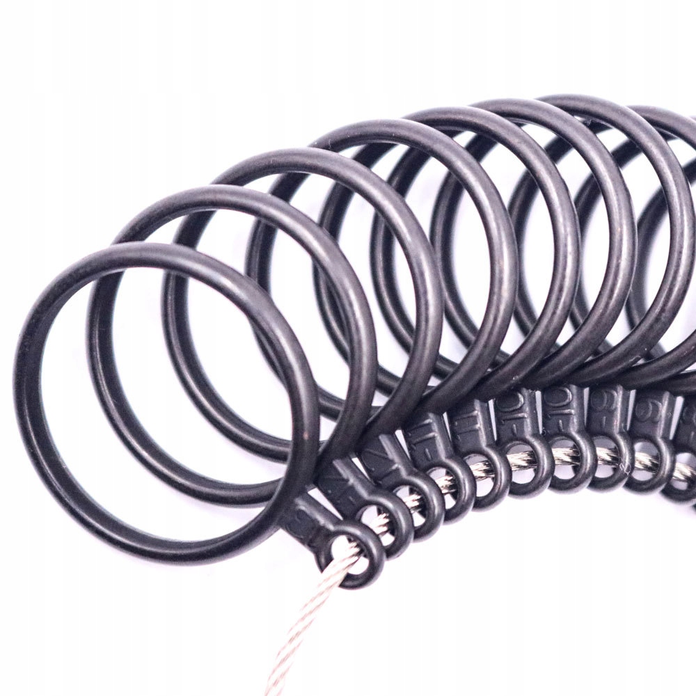 ✅ Rozmiary są stemplowane na trzpieniu każdego pierścienia i są umieszczone na elastyczny kablu, dzięki czemu można go w razie potrzeby otworzyć i wyjąć konkretną obrączkę, aby następnie sprawdzić na trzpieniu rozmiar.
