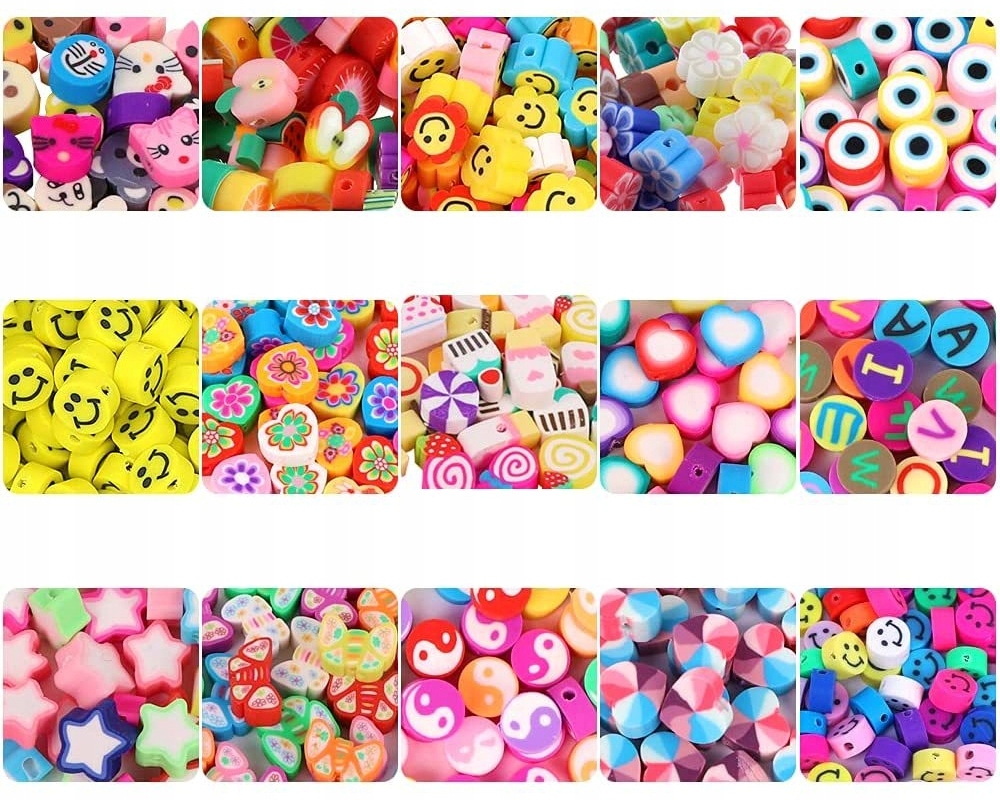 W zestawie znajdziemy gumowe koraliki w wielu kolorach i wzorach, gumka silikonowa, ogniwa, zapięcia, kolczyki