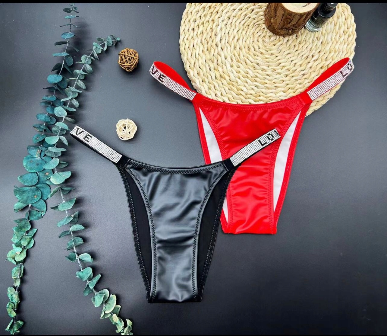 Uzupełnieniem kompletu bielizny LOVE są figi wykonane z elastycznego materiału imitacja skóry oraz ozdobione cyrkoniami LOVE. Mały pasek, a tyle blasku! Figi z wysokim stanem, wysoko wykrojonymi nogami i mocno odsłoniętym tyłem. Przód oraz tył to gładki skóropodobny materiał . Figi doskonale eksponują krągłość pośladków, nie ograniczają ruchów i gwarantują przewiewność. Kroczek wyściełany bawełną.