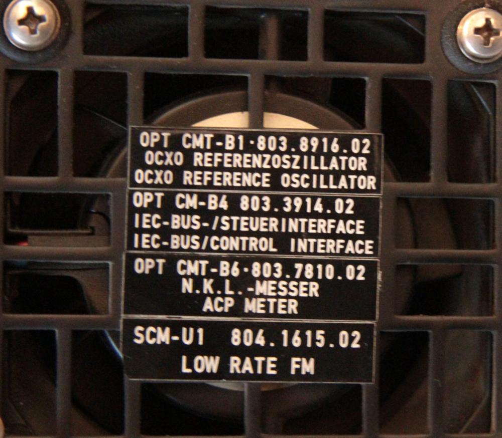 Zamontowane opcje B1 - wysokostabilny generator kwarcowy, B4 - GPIB/ICE-BUS, B6 - miernik mocy w kanale, U1 - wąskopasmowe FM.