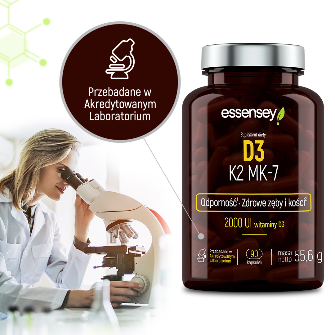 Пищевая добавка ESSENSEY D3 K2 MK - 7 содержит витамин К2 и витамин D3, который поддерживает иммунитет и помогает поддерживать здоровье зубов и кость2.