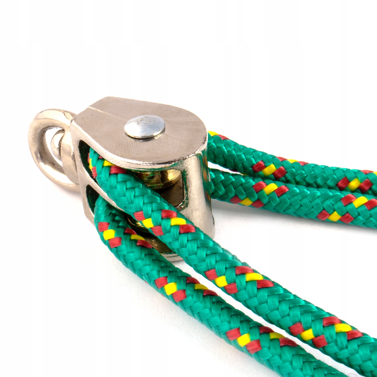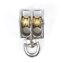 Bloczek obrotowy linowy niklowany z dwoma kółkami oraz krętlikiem, przeznaczony do ręcznego podnoszenia oraz podwieszania ciężarów z użyciem lin.