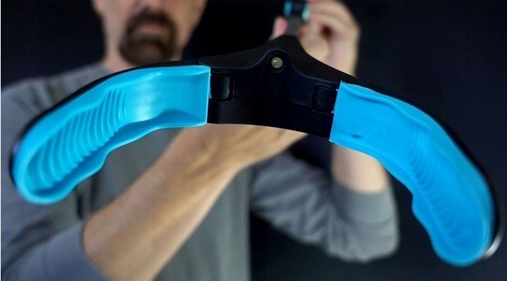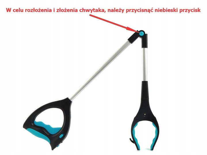 W celu rozłożenia i złożenia chwytaka, należy wcisnąć niebieski przycisk, znajdujący się w miejscu składania urządzenia. Rozkładanie bez wciśniętego przycisku, może uszkodzić urządzenie, uniemożliwiając blokadę w pozycji rozłożonej.