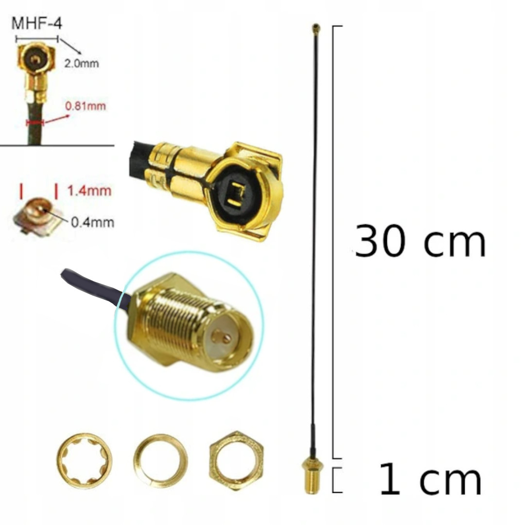 Złącze MHF4 ( IPX IPEX 4 genracji) jest zdecydowanie mniejsze od najbardziej popularnego złacza U.FL. Proszę zapoznać się z grafiką na końcu aukcji, któa wyjasnia różniece pomiedzy złączami MHF4 vs. U.FL