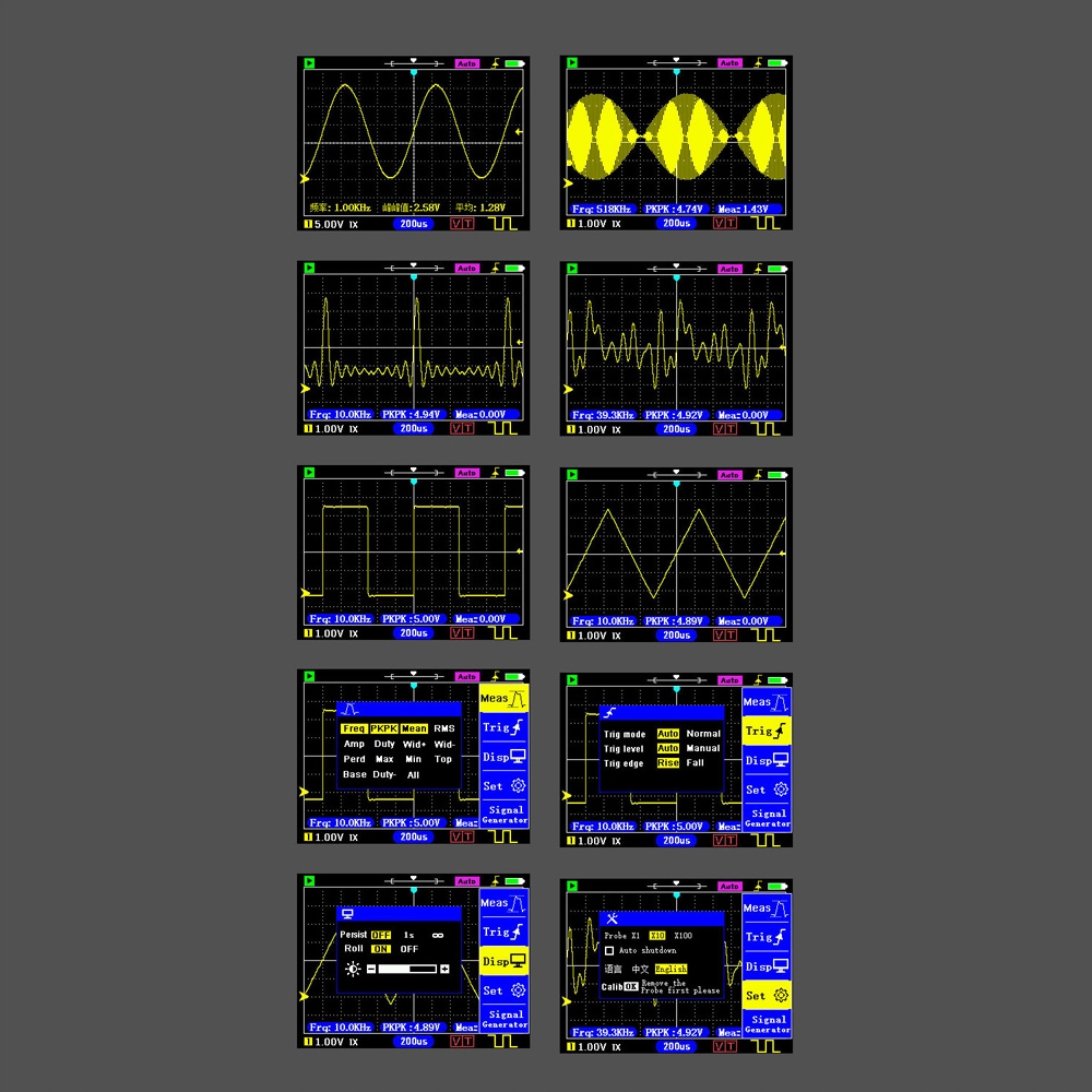 Łatwy w użyciu: automatyczna regulacja, zatrzymanie, menu i pojedynczy wyzwalacz można wykonać jednym kliknięciem. Skalowanie i ruch kształtu fali można wykonać, po prostu naciskając przycisk trybu, aby przełączać się między 4 przyciskami kierunkowymi, co jest bardzo wygodne.