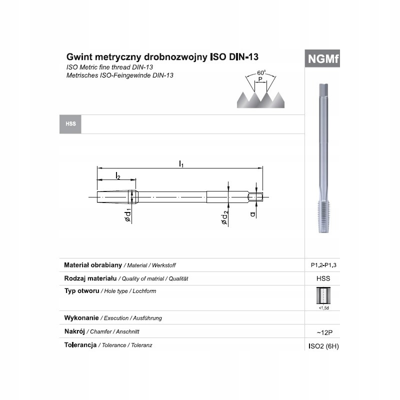 Gwintownik maszynowy NGMF z gwintem metrycznym drobnozwojnym jest przeznaczony do wykonywania nakrętek, ale można stosować go również do wykonywania głębokich otworów przelotowych. Materiał, z jakiego został zrobiony gwintownik - wysokowydajna stal szybkotnąca - charakteryzuje się wysoką odpornością na zużycie. Poddanie obróbce w piecu próżniowym zapewnia wysoką twardość narzędzia przy zachowaniu dobrej ciągliwości. Gwintownik jest idealny do pracy w stali automatowej, stali konstrukcyjnej, stali do nawęglania, stali konstrukcyjnej węglowej i niskostopowej, staliwie.