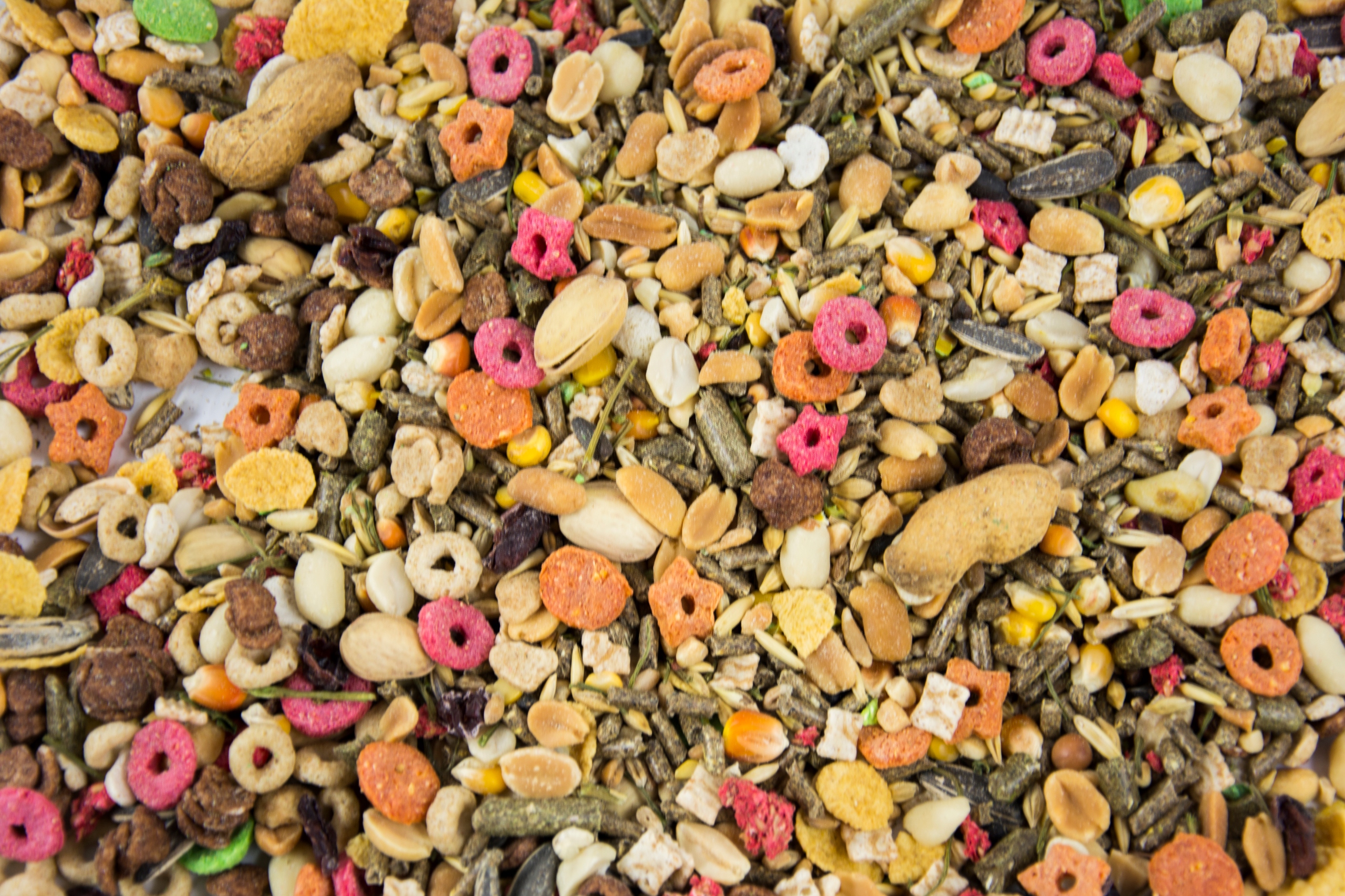 овес, пшеница, безмасляный овес, черный подсолнечник, мелкий подсолнечник, четверть кукурузы, кукуруза, хлопья гороха, кормовой горох, грубый красный, сорго белый, желтый горох, рапс, морковь, хлебобулочные изделия, цукаты, арахис, фундук, орехи кешью, арахис, бразильские орехи, Орехи макадамия, сезонные добавки