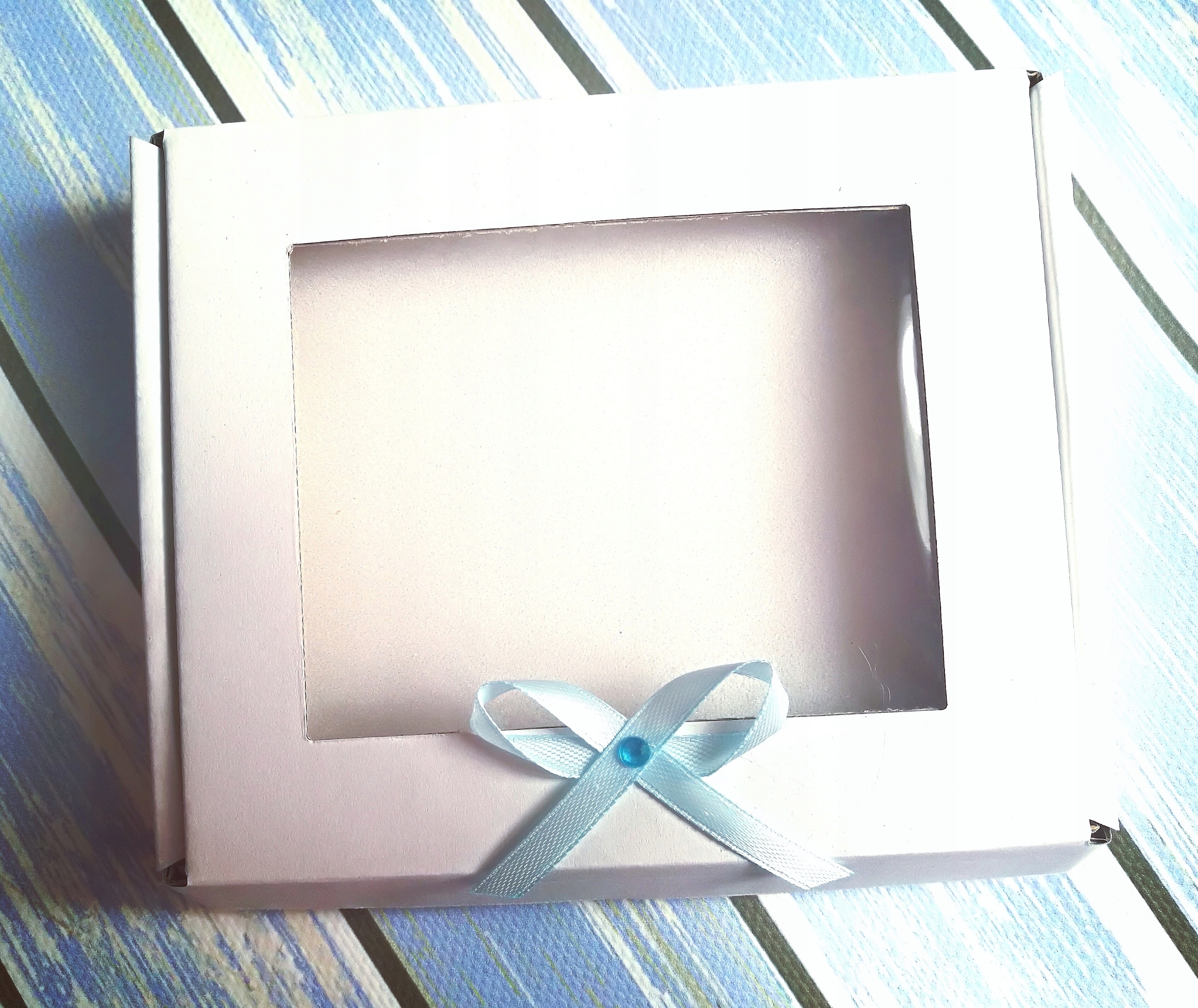 Podwiązka zapakowana w pudełko białe kokarda na pudełku dopasowana do koloru kokardy na podwiązce