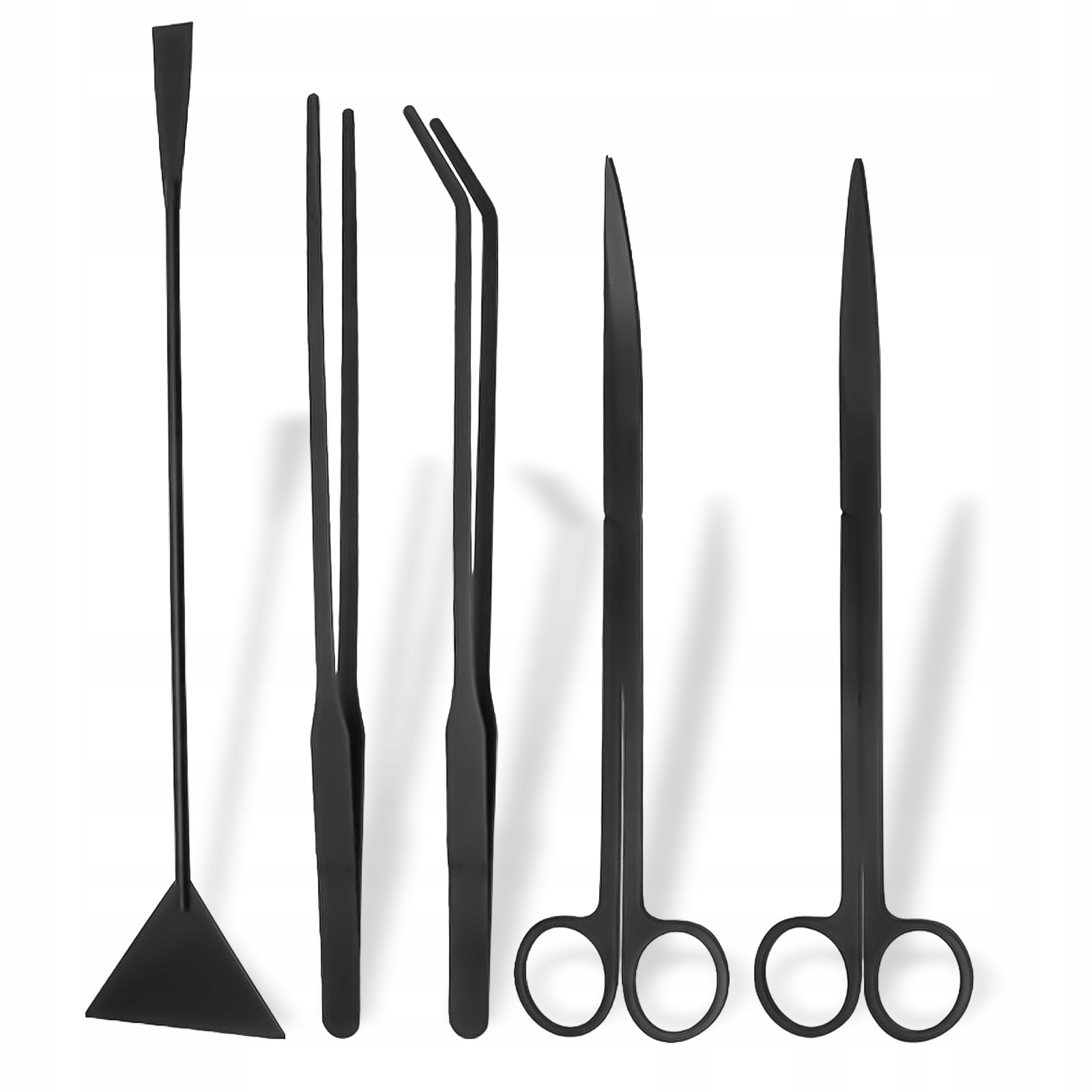 Zestaw przyborów do pielęgnacji akwarium, terrarium wyposażony w 5 elementów, czyli pęseta prosta i zakrzywiona, nożyczki proste i zakrzywione, sand flatter (szpatułka do podłoża). Zestaw jest doskonały do przesadzania, strzyżenia i podtrzymywania roślin podczas prac porządkowych oraz karmienia gadów i płazów.