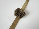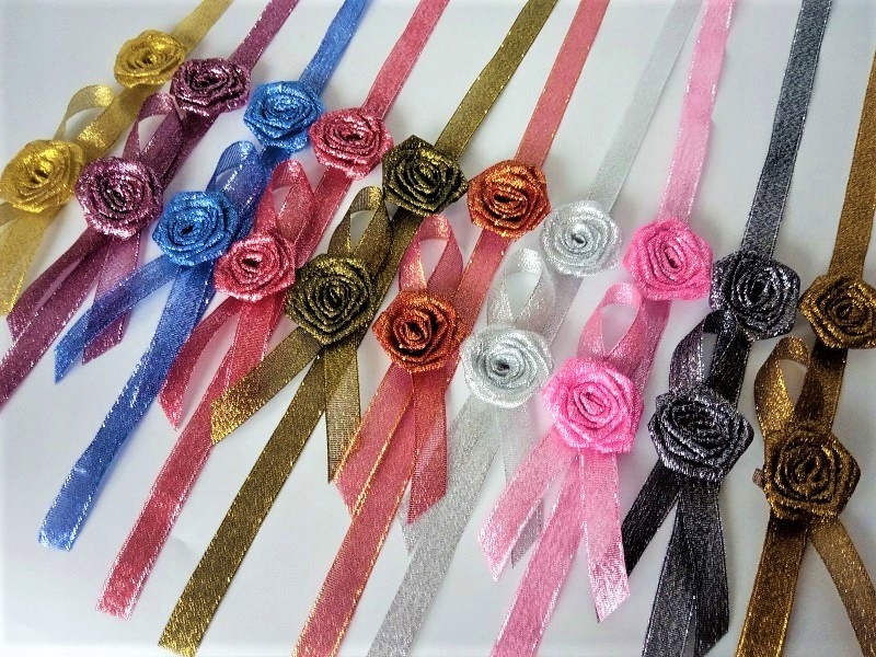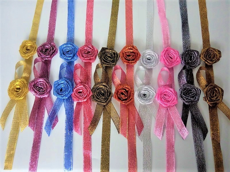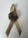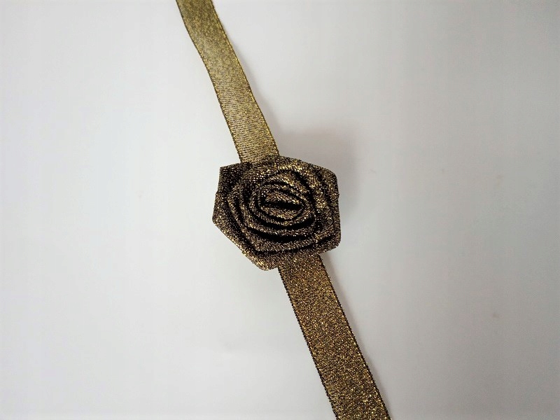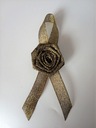 Przypinka wykonana jest z brokatowej satynowej tasiemki o szerokości ok. 1,2cm i różyczki.