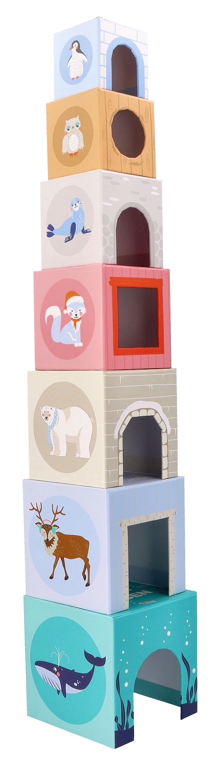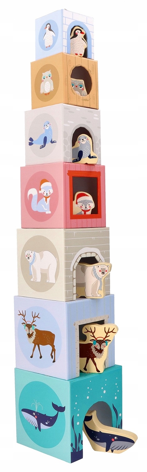 Piramida z kubeczków - Zwierzęta Arktyczne marki Adam Toys to zestaw składający się kolorowych klocków-pudełek z grubego kartonu.