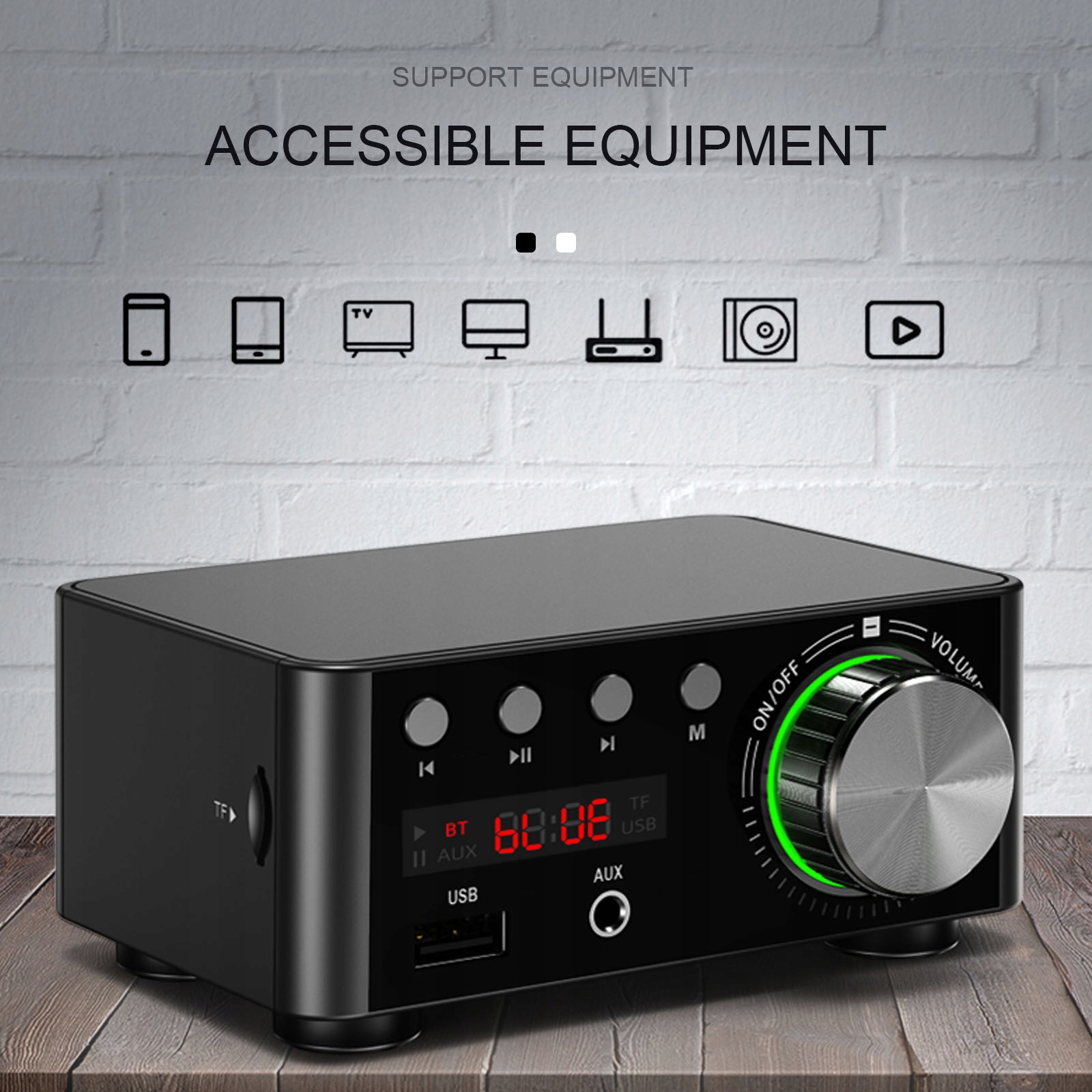 1. Как цифровой усилитель мощности и музыкальный плеер, он поддерживает входы RCA/AUX/USB / BT 5.0 / TF, почти совместим со всеми домашними аудиоустройствами, такими как телефон, планшет, компьютер, телевизор, приставка, CD-плеер и т. д. , U-диск и TF-карта поддерживают форматы без потерь WAV, APE, FLAC.