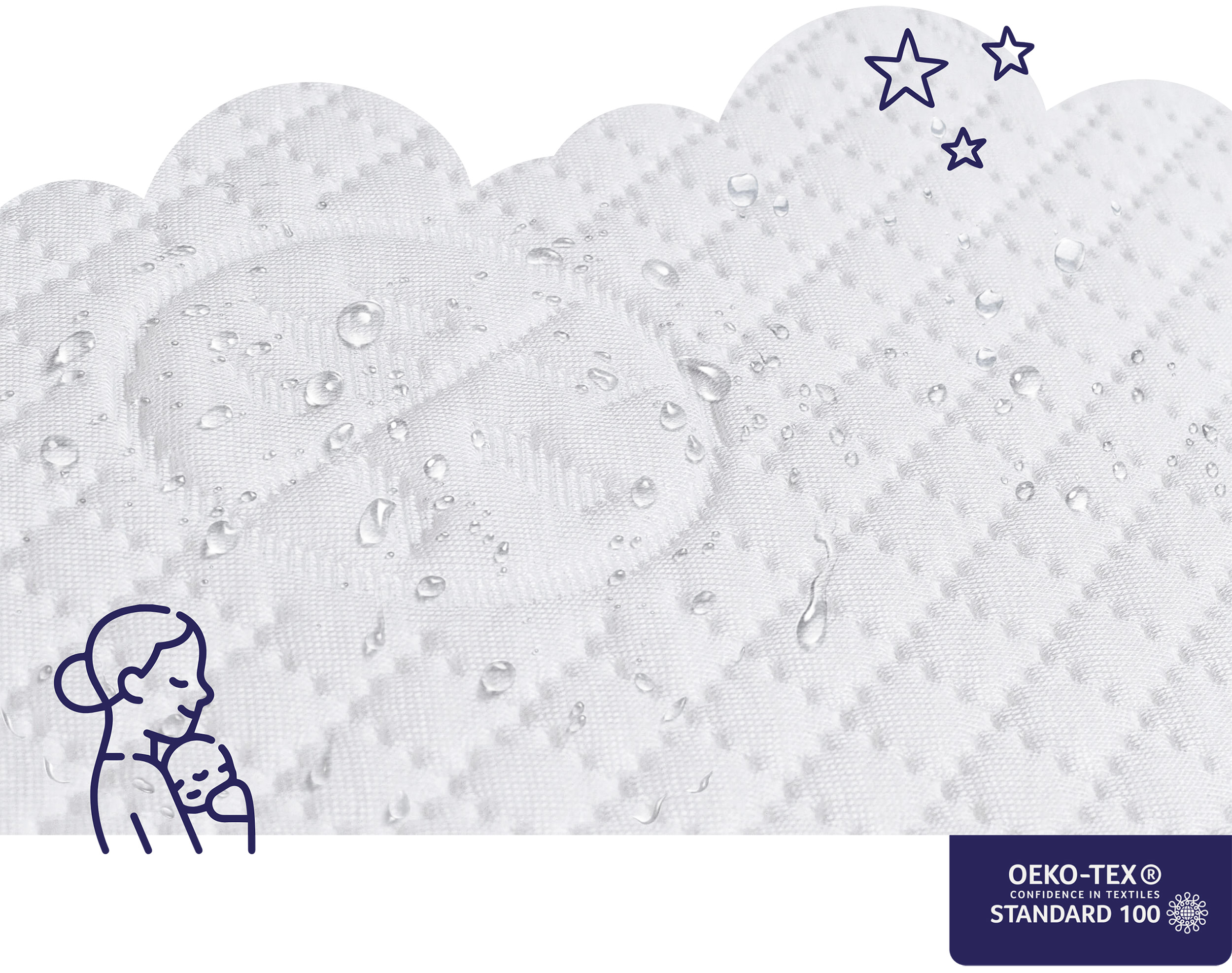 Powleczenie Hydro MAX ze specjalnym kroploszczelnym woskiem sprawia, ze pokrowiec oddycha a jednocześnie skutecznie spowalnia przenikanie wilgoci do wnętrza materaca.