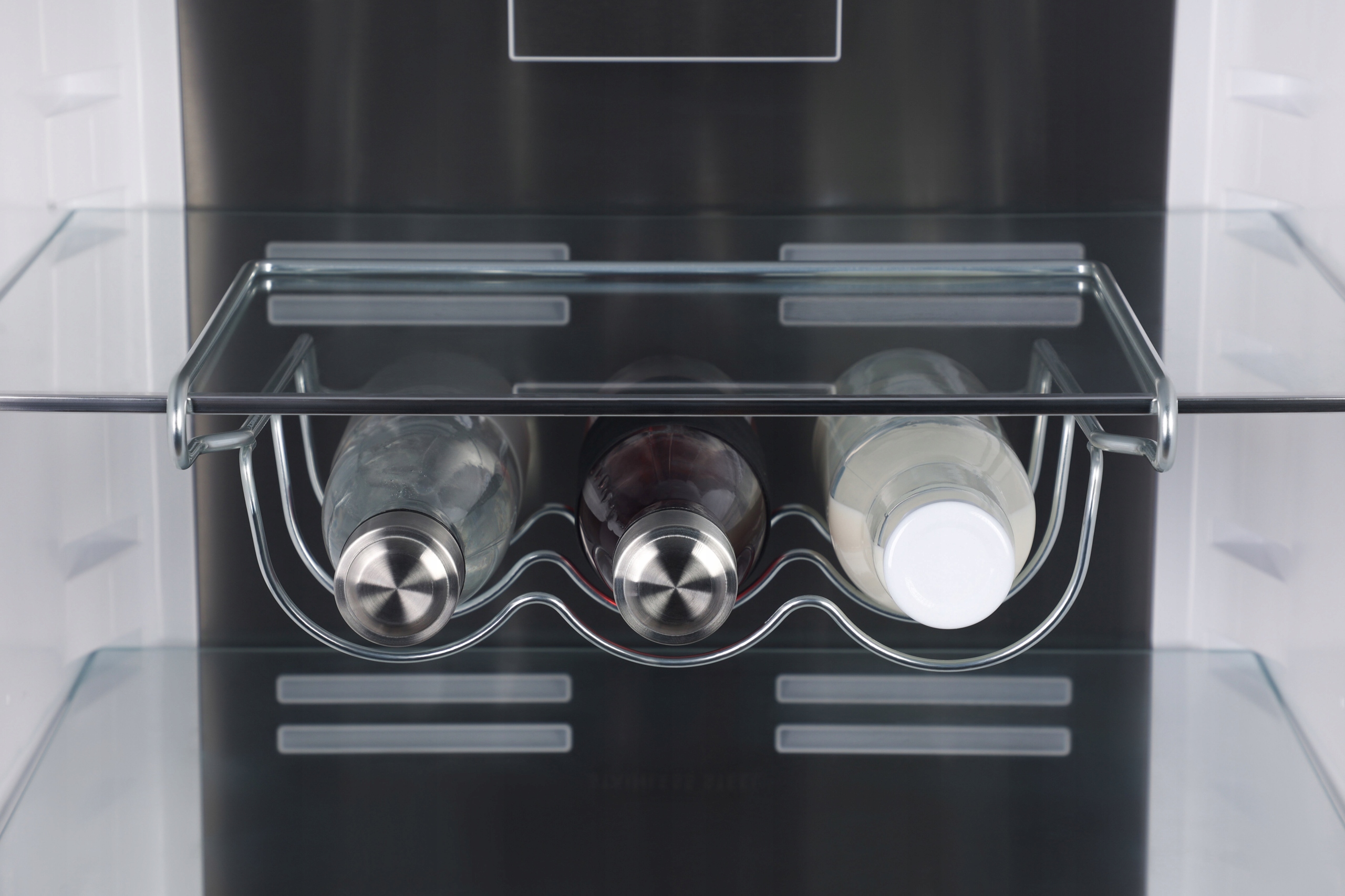 Uniwersalna półka na butelki pasuje do każdej lodówki. Oszczędzaj miejsce! Przy zaledwie 10 cm wysokości półka umożliwia przechowywanie maksymalnie do trzech butelek 1,5 l lub sześciu puszek 0,33l.