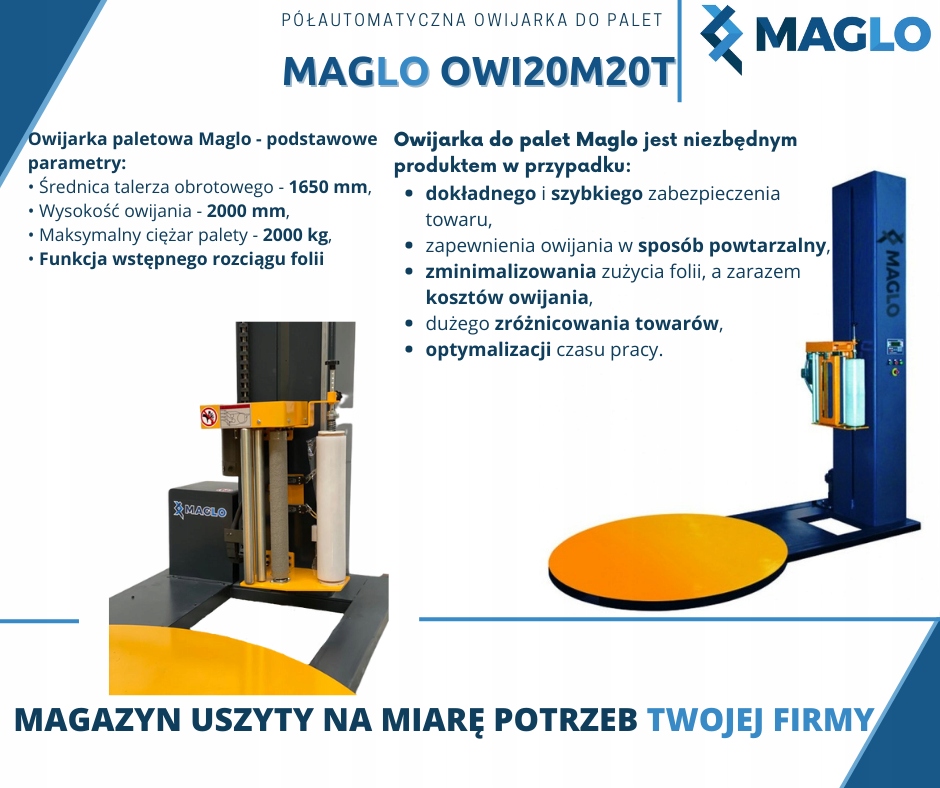 Owijarki do palet Maglo są używane do owijania folią stretch załadowanej palety. Folia zapewnia świetne wsparcie w czasie transportu produktu i jego przechowywania, a także zapobiega przewróceniu, pochyleniu czy uszkodzeniu palety z towarem. W dodatku, owinięte ładunki stają się łatwiejsze do komisjonowania oraz identyfikacji. Urządzenia do pakowania Maglo wykonane są z trwałych materiałów i podzespołów wiodących producentów, co zapewnia ich bezawaryjność, dzięki czemu mogą być użytkowane przez długi czas.