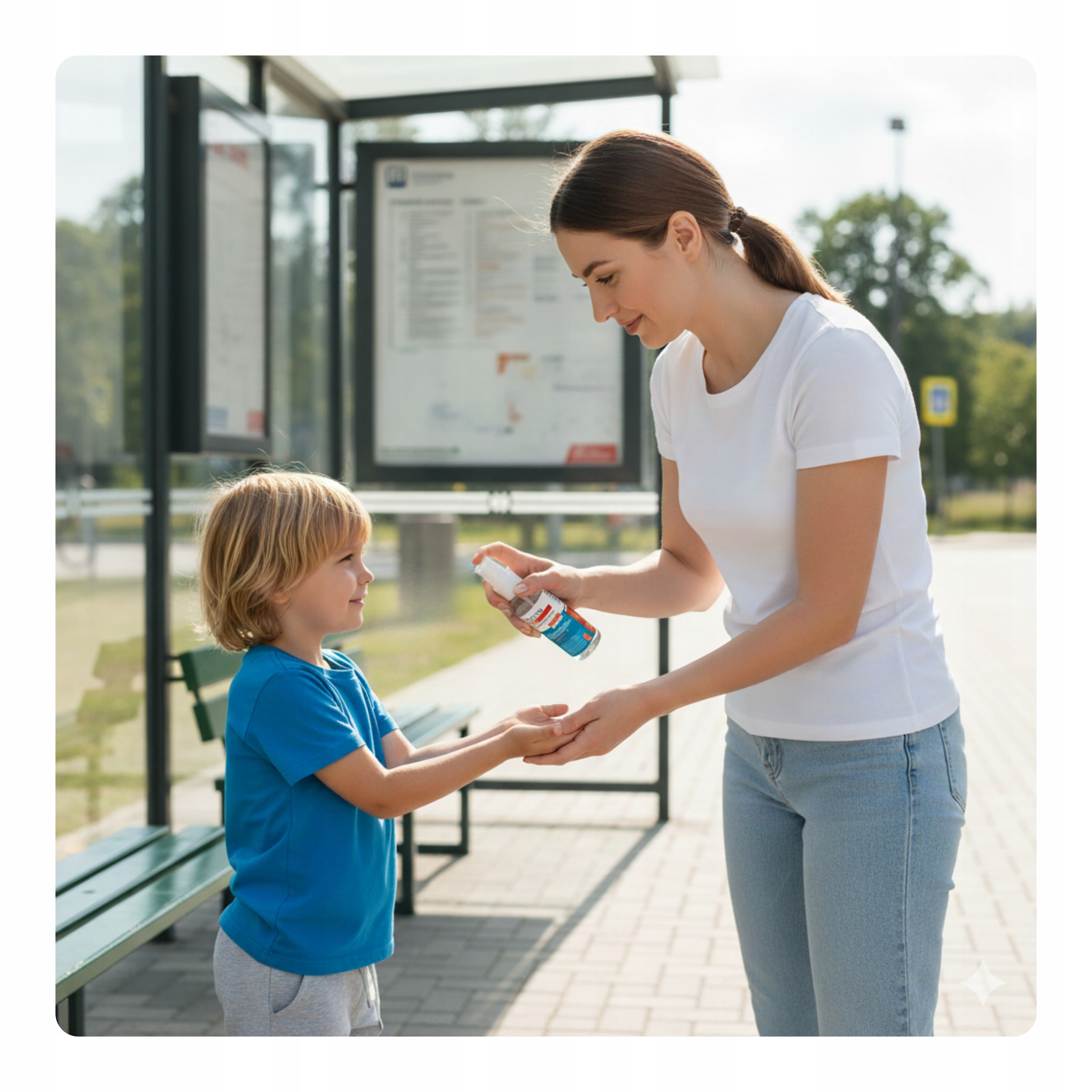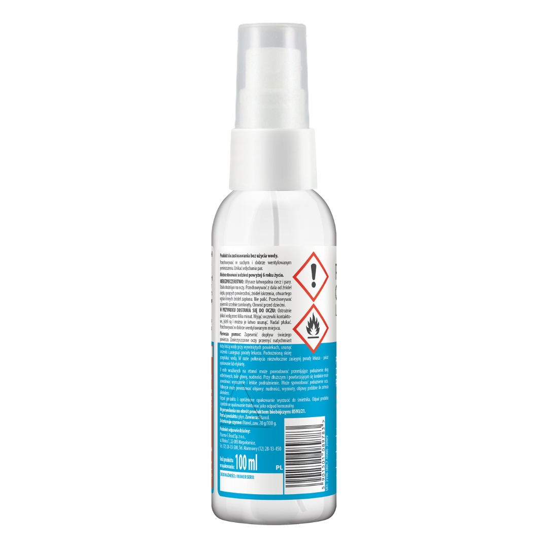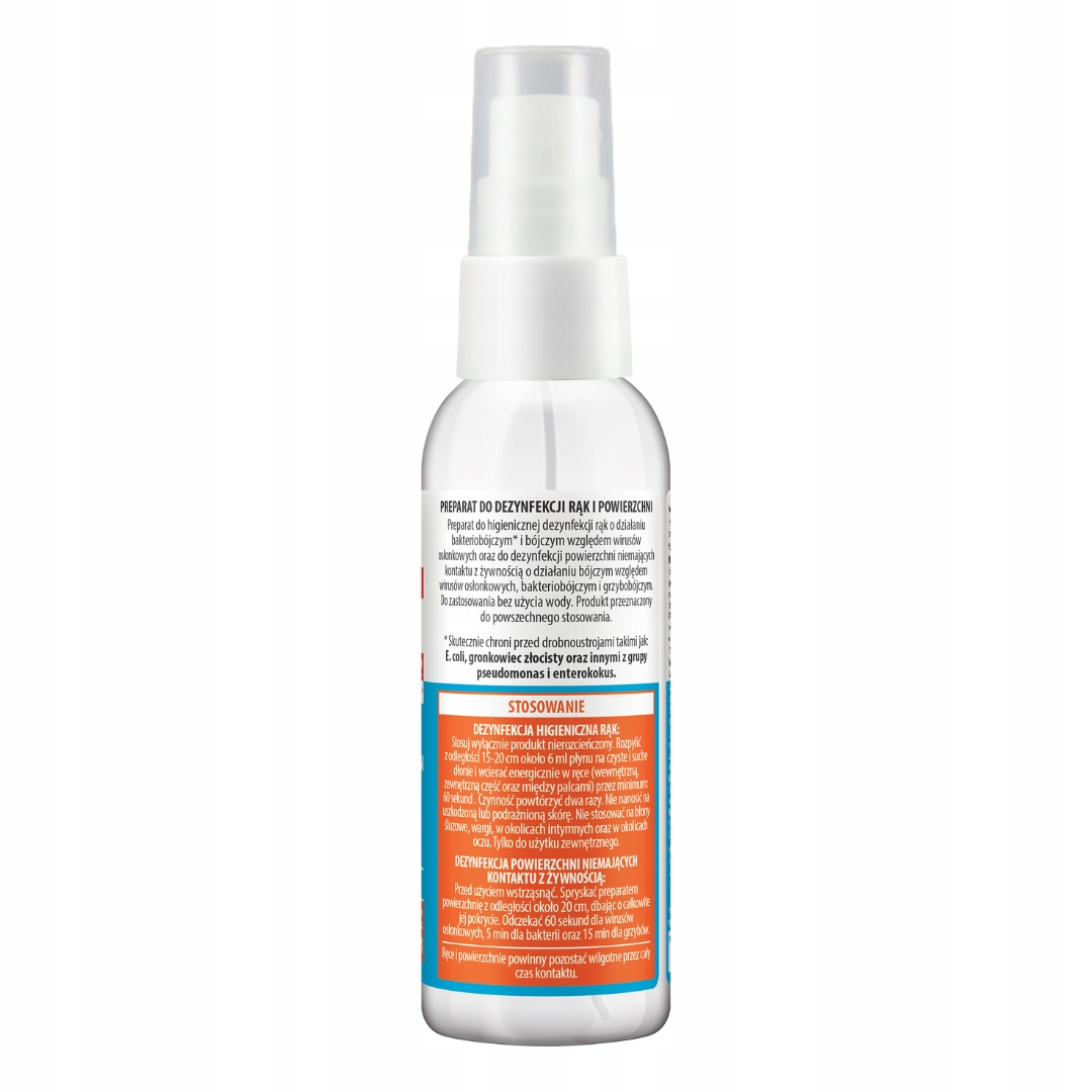 Aby zapewnić skuteczną ochronę, stosuj produkt nierozcieńczony. Rozpyl niewielką ilość (ok. 3 ml) na dłonie, wcieraj energicznie przez minimum 30 sekund, aż skóra stanie się sucha. W przypadku powierzchni spryskaj z odległości 15-20 cm i pozostaw do wyschnięcia lub przetrzyj czystym ręcznikiem papierowym. Nie stosować na uszkodzoną skórę, błony śluzowe ani okolice oczu.