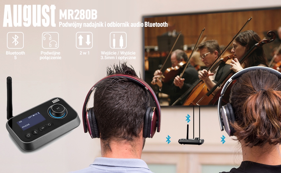 August MR280 jest zarówno nadajnikiem, jak i odbiornikiem Bluetooth. Ten produkt 2 w 1 umożliwia dodanie funkcji Bluetooth do urządzeń nie posiadających tej technologii i bezprzewodowe słuchanie programów lub ulubionych utworów.