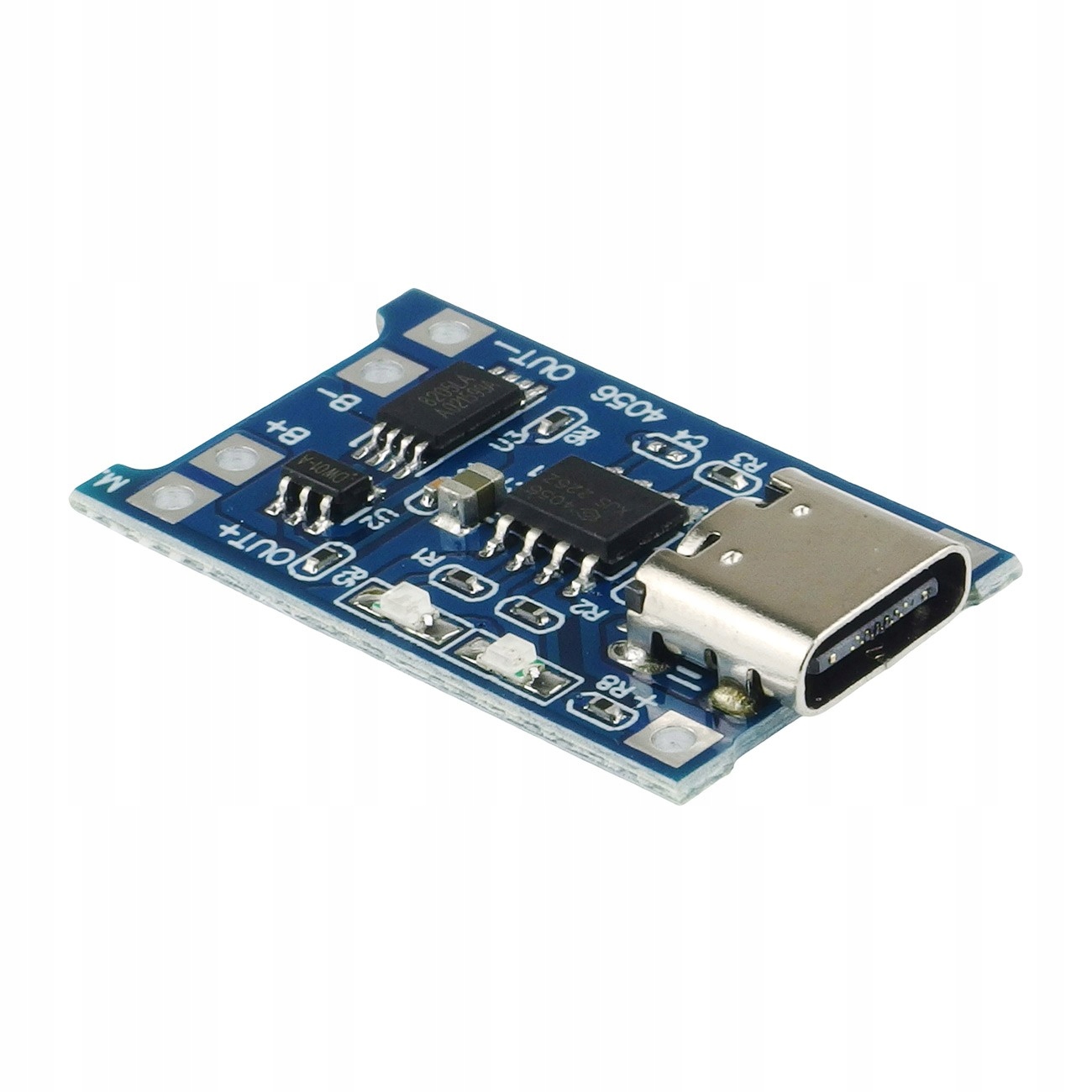 Moduł ładowania TP4056 jest oparty na układzie TP4056, który pełni funkcję kontrolera ładowania akumulatora litowo-jonowego. Układ ten monitoruje prąd i napięcie, zapewniając efektywne i bezpieczne ładowanie ogniw. Wbudowane zabezpieczenia chronią akumulator przed uszkodzeniem w wyniku przeładowania, nadmiernego rozładowania oraz zwarcia. Dodatkowo, diody LED ułatwiają obserwację stanu ładowania: czerwona dioda oznacza aktywne ładowanie, a niebieska informuje o zakończeniu procesu.