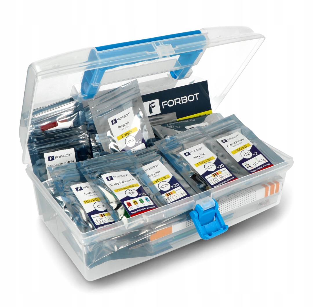 В комплект входят электронные компоненты, спасибо на практике вы сможете выполнять все упражнения. Все детали поставляются в описанные пакеты, которые были помещены в коробку.