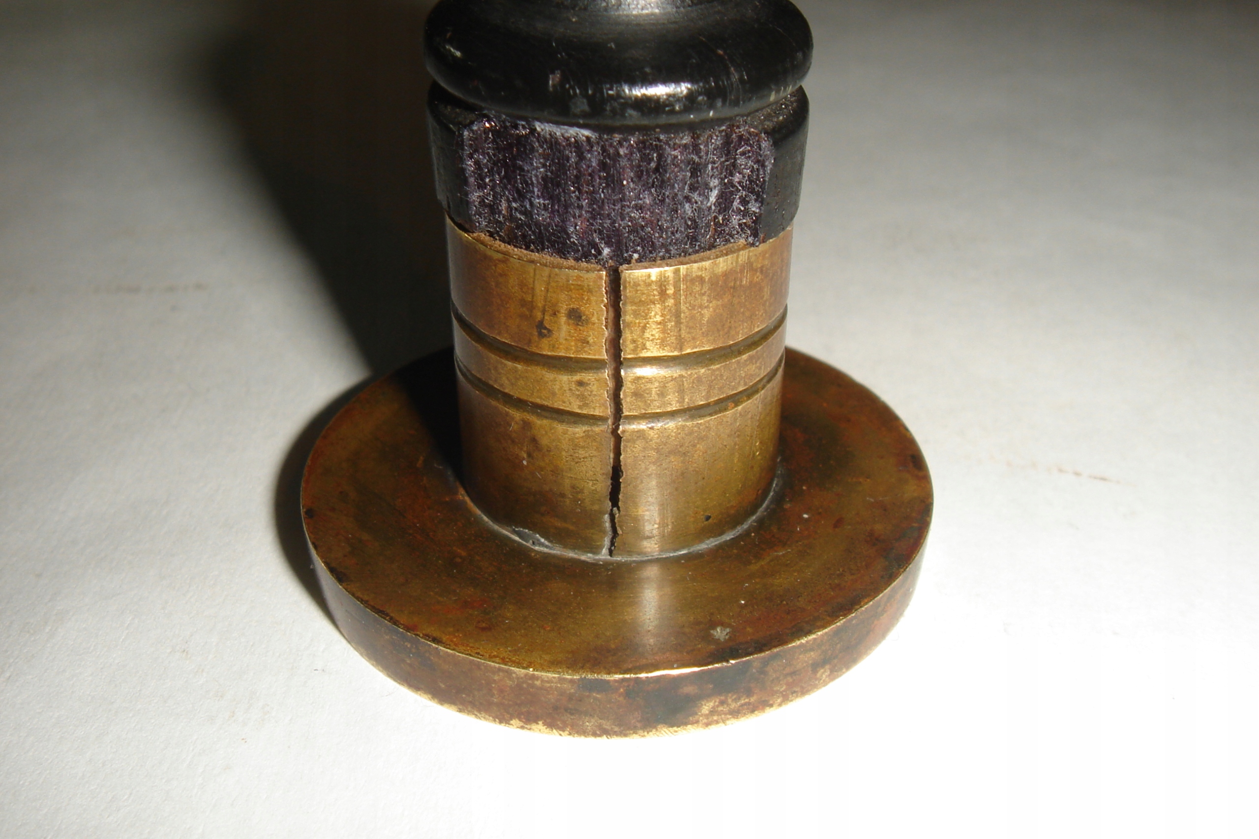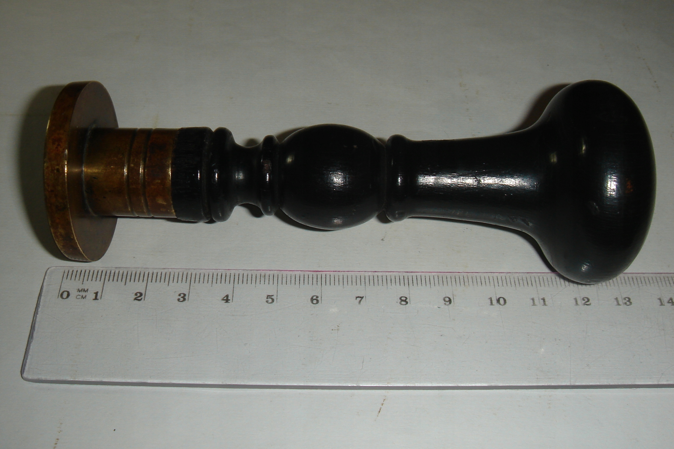 Stan bardzo dobry - patrz foto. Jedyną wadą jest pęknięta obejma uchwytu - patrz 4 foto. Oryginalna i kompletna XIX wieczna pieczęć tuszowa do dokumentów, kościoła diecezji gandawskiej w Belgii. Wykonana w mosiądzu, uchwyt drewniany. Średnica tłoka: 4 cm; wysokość całkowita z uchwytem: 12,8 cm.