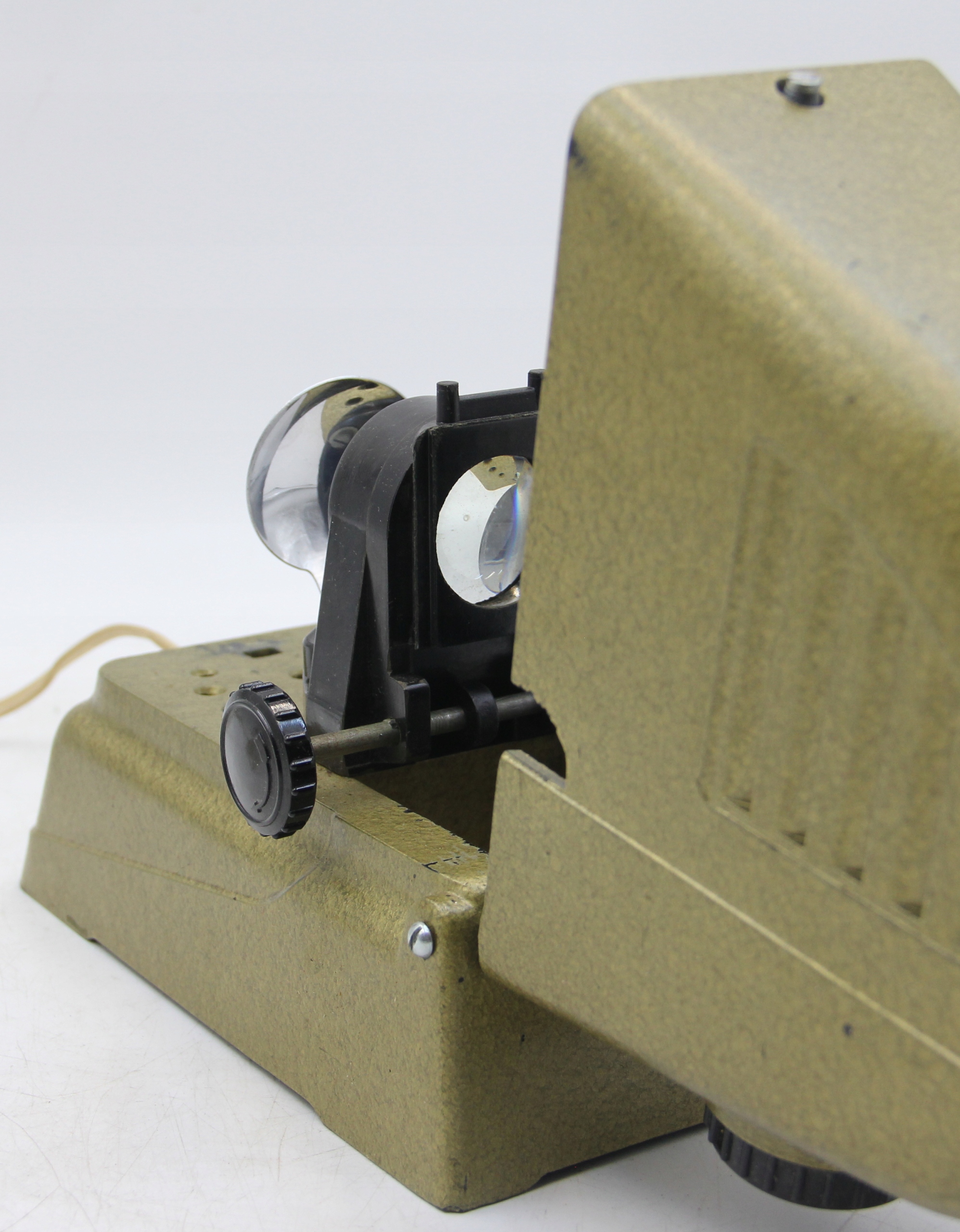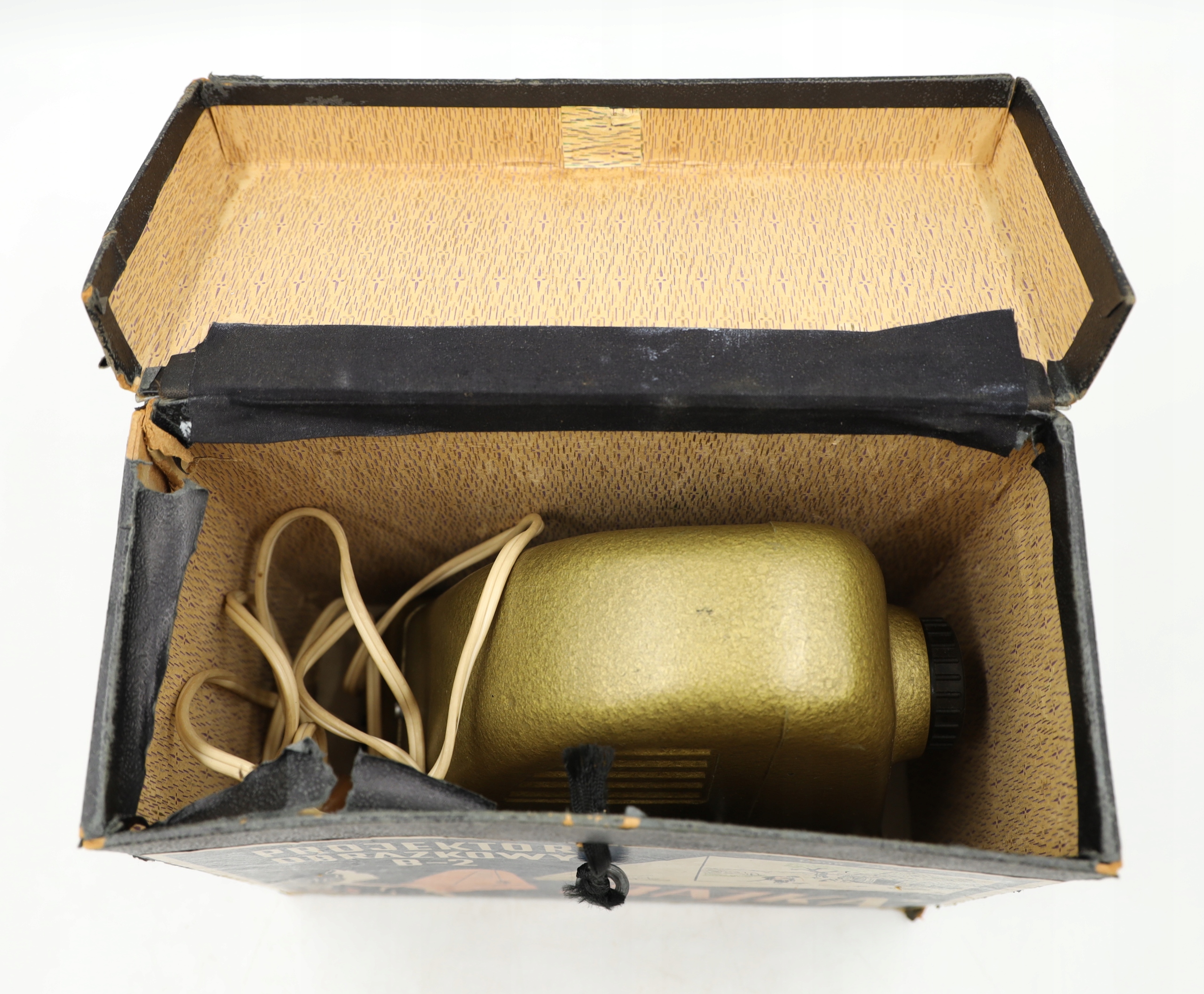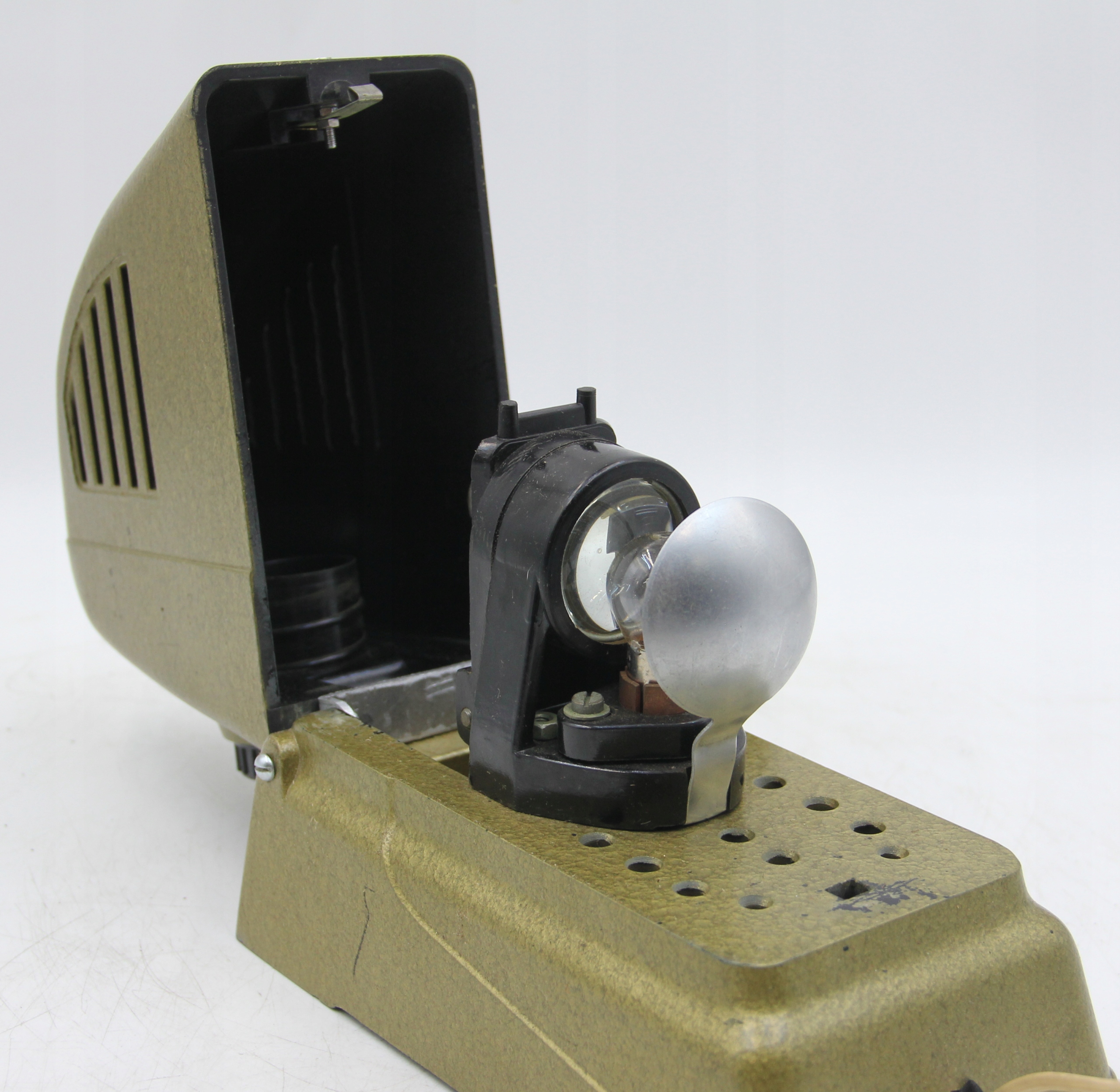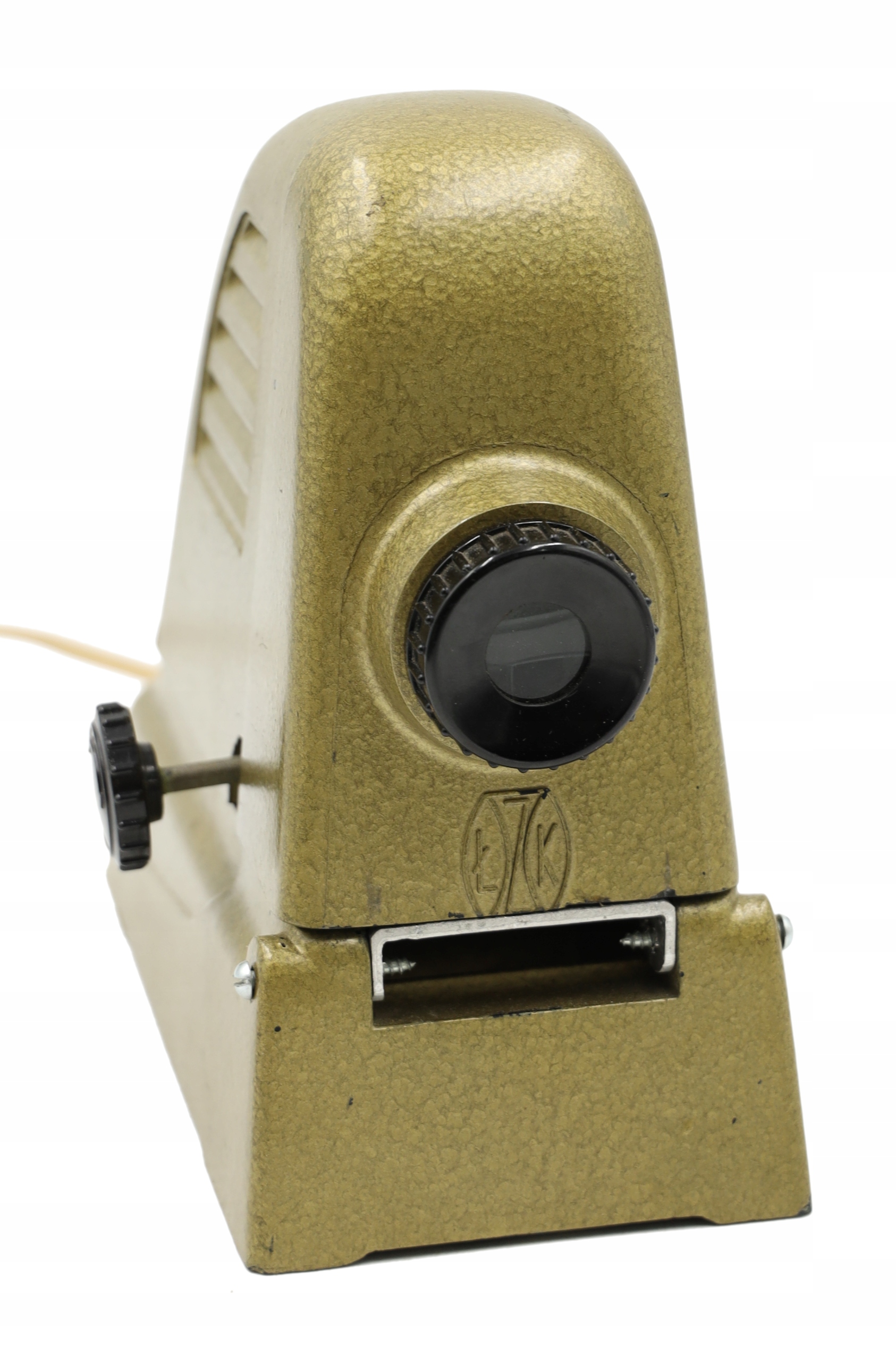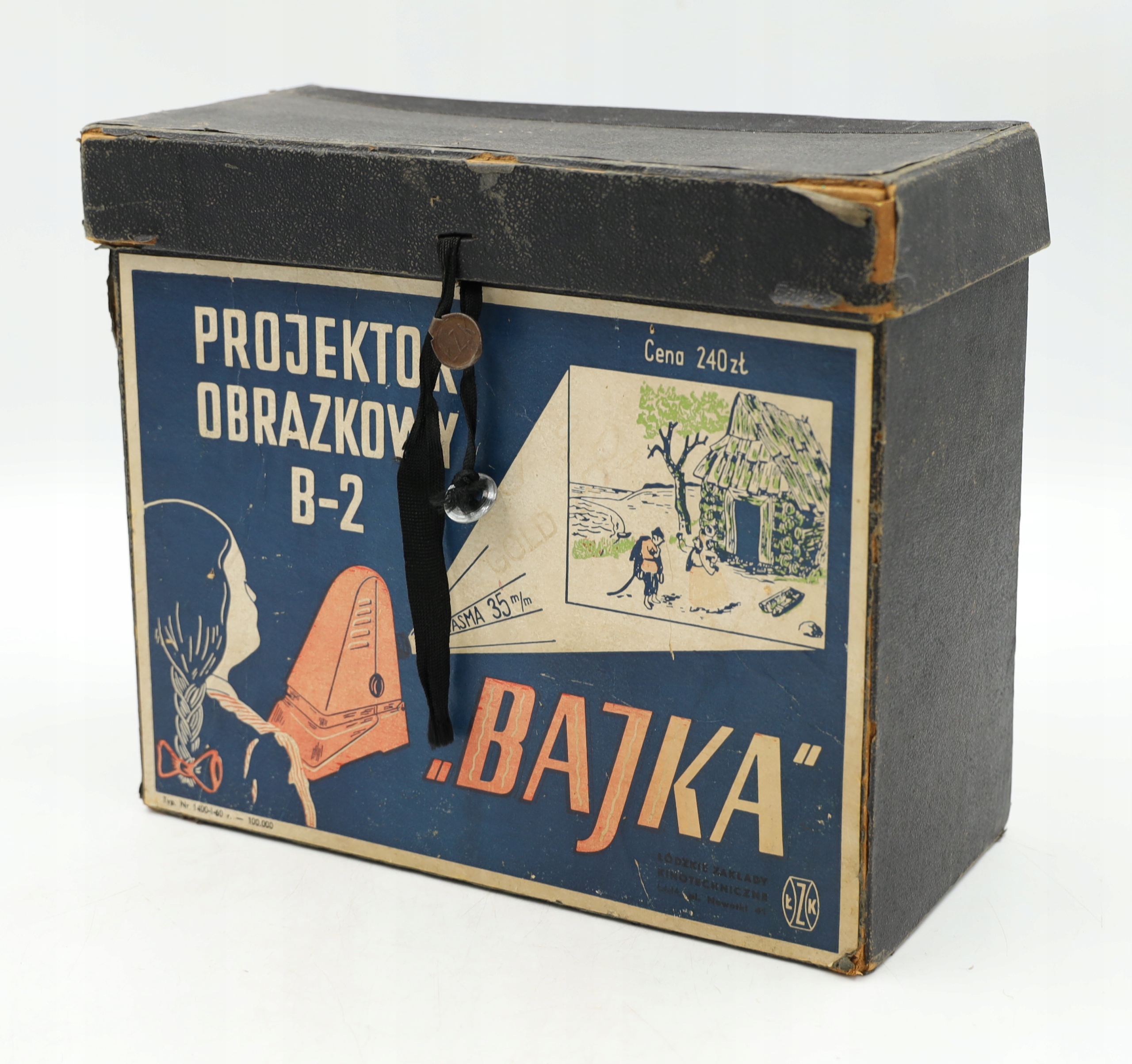 Projektor "Bajka", produkowany przez Łódzkie Zakłady Kinotechniczne w latach 50/60-tych. Niesprawny, brak elementu na dodanie kliszy. Ślady użytkowania. Wymiary opakowania: 22 x 26 x 12 cm. Polecam