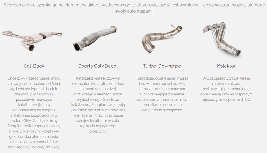 W zależności od modelu pojazdu w układach Scorpion stosowana jest większa średnica rur, dzięki czemu spaliny są w stanie szybciej wydostać się na zewnątrz, co przekłada się na znaczne zwiększenie potencjału silnika do tuningu.