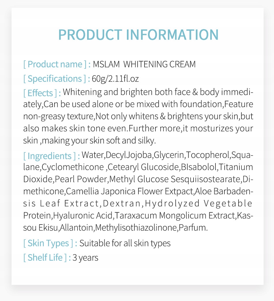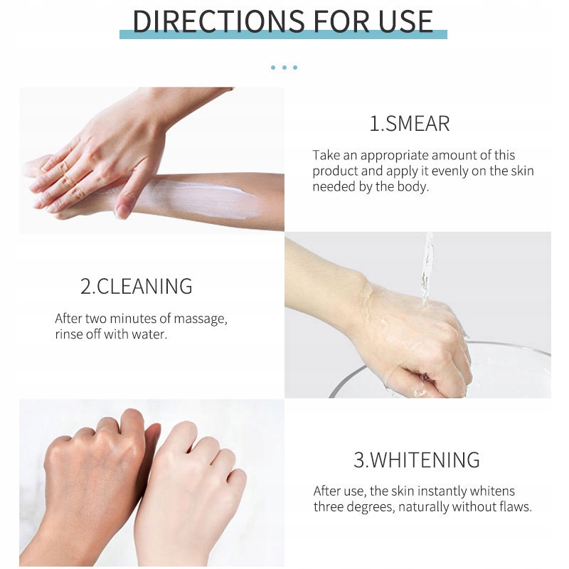 【MOCNE WYBIELANIE ROZ IJAŚNIANIE】 - Nasz krem wybielający zawiera specjalne składniki, które wybielają skórę na ciele. Zawiera różne esencje ekstrakcyjne, które są bezpieczne, łagodne, naturalne, przyjazne dla skóry, nietoksyczne i nieszkodliwe dla skóry.